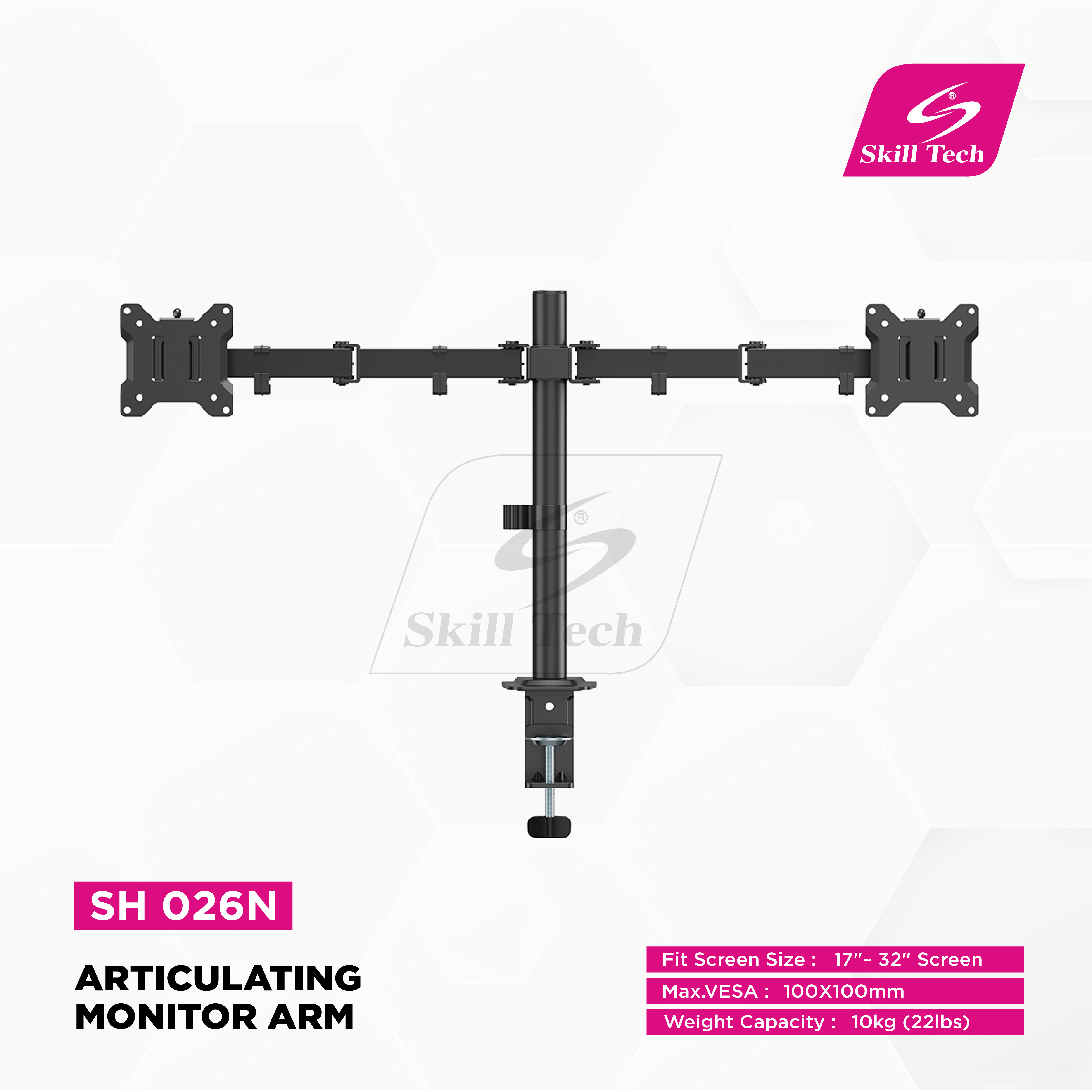 The SH 026N Articulating Monitor Arm is an economy dual-screen solution designed for flexibility and space-saving setups. Made from steel and plastic with a matte black powder-coated finish, it supports most 17"-32" flat and curved monitors up to 10kg each. With tilt +45°~-45°, swivel +90°~-90°, and +180°~-180° screen rotation, along with 376mm full extension, it allows precise positioning. Quick-release VESA plates, cable management, and clamp or grommet installation ensure a clean and organized workspace.