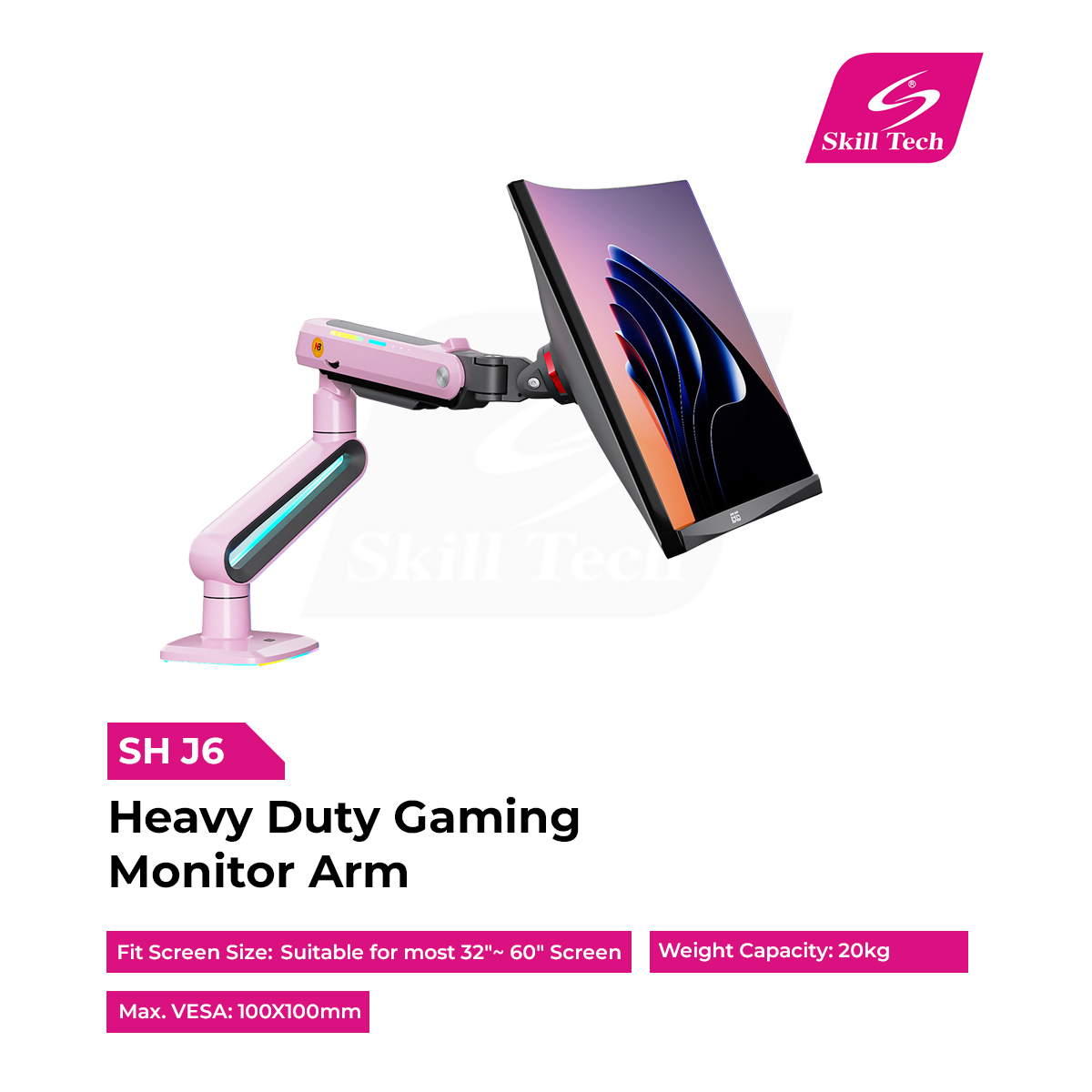 The SH J6 Heavy-Duty Gaming Monitor Arm is a premium ergonomic solution designed for gamers and professionals. Built from steel, aluminum, and plastic with a durable powder-coated finish, it supports most 32"-60" flat and curved monitors up to 20 kg. Featuring tilt +50° ~ -50°, swivel +90°~-90°, 360° rotation, 260mm lift, and 620mm full extension, it allows precise positioning. Quick-release VESA plates and integrated cable management ensure a clean, organized, and efficient workspace.