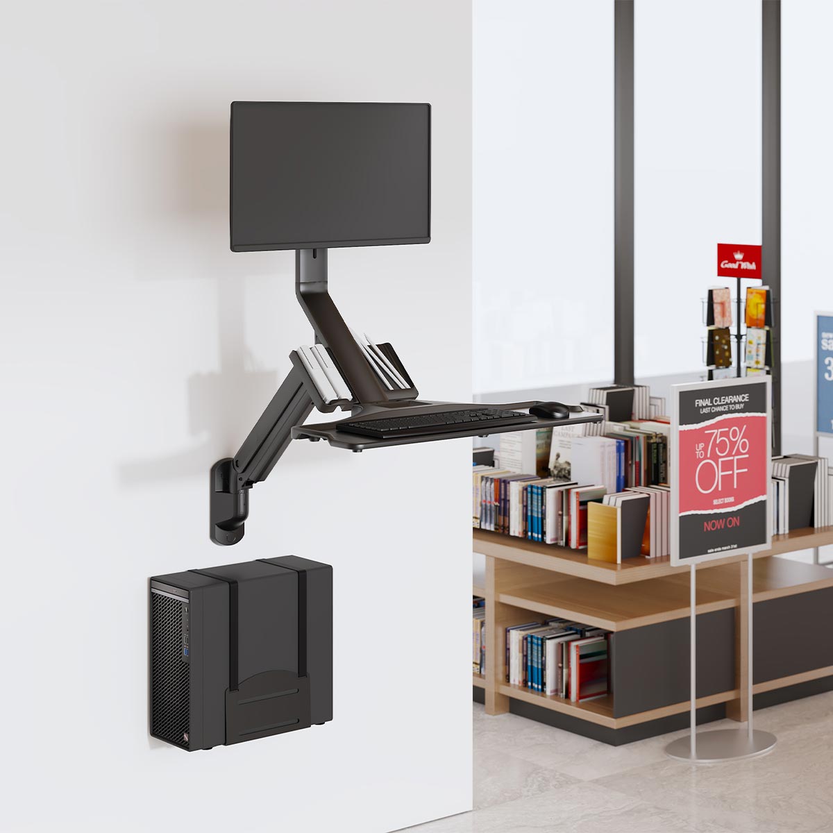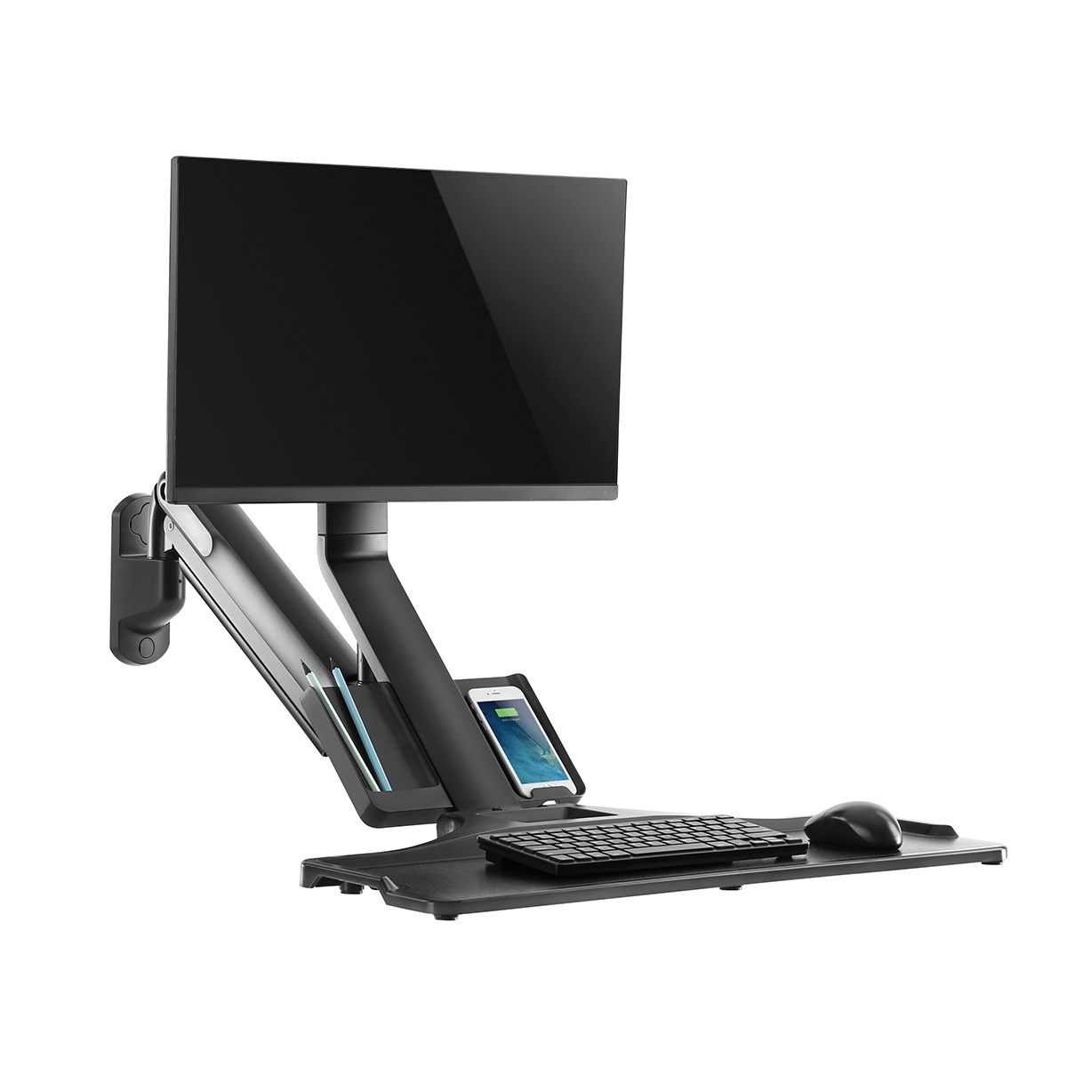 Mounts directly to the wall to free up desk space and includes a keyboard tray with 1kg capacity.