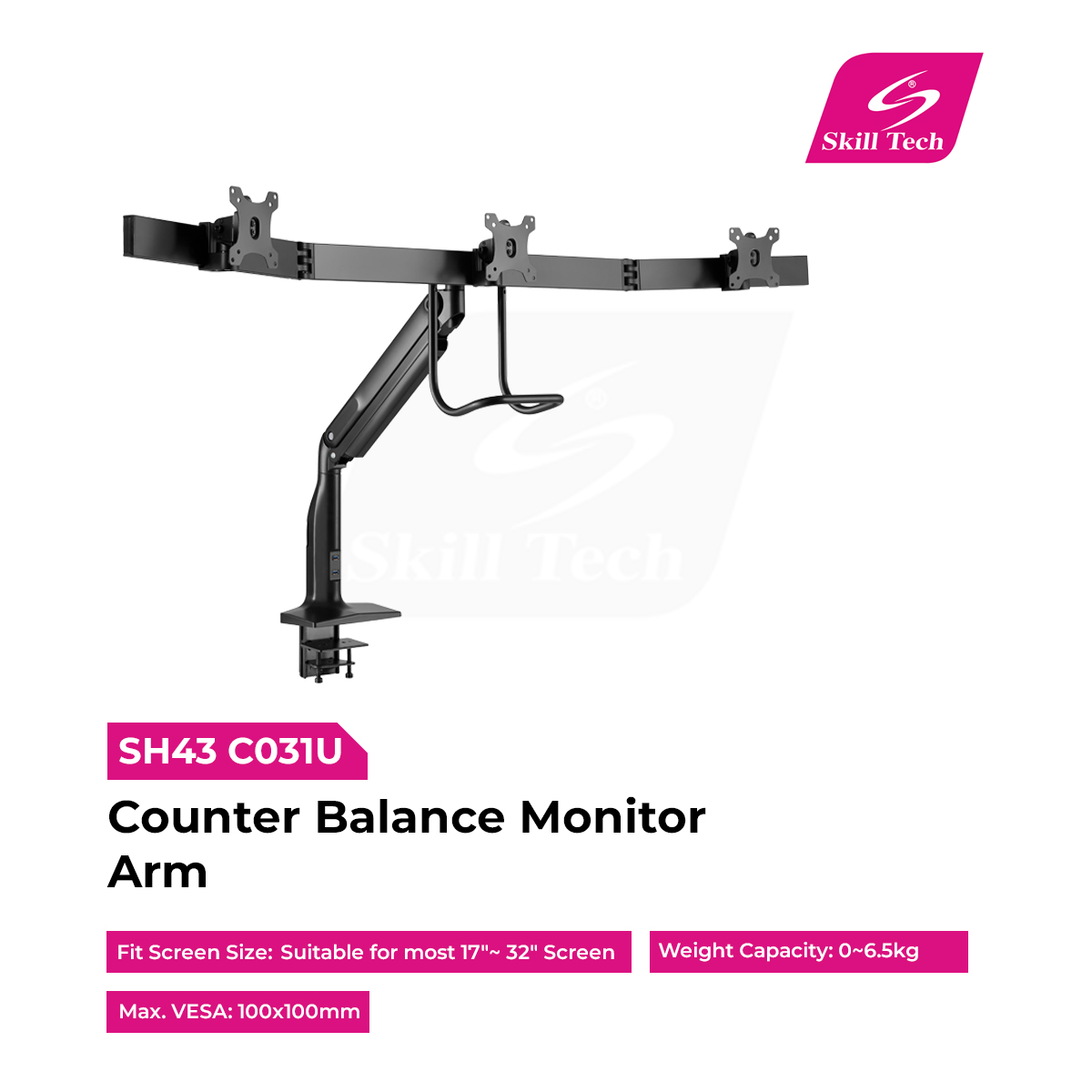 The SH43 C031U Counterbalance Monitor Arm offers smooth, ergonomic adjustment for screens between 17"~ 32". Built from durable steel, aluminum, and plastic with a matte black powder-coated finish, it supports up to 6.5kg per screen. The gas spring mechanism allows effortless tilt +45°~-22°, swivel +32°~-32°, and rotation +90°~-90°. Compatible with both clamp and grommet installations, it includes integrated cable management for a clean, organized workspace.