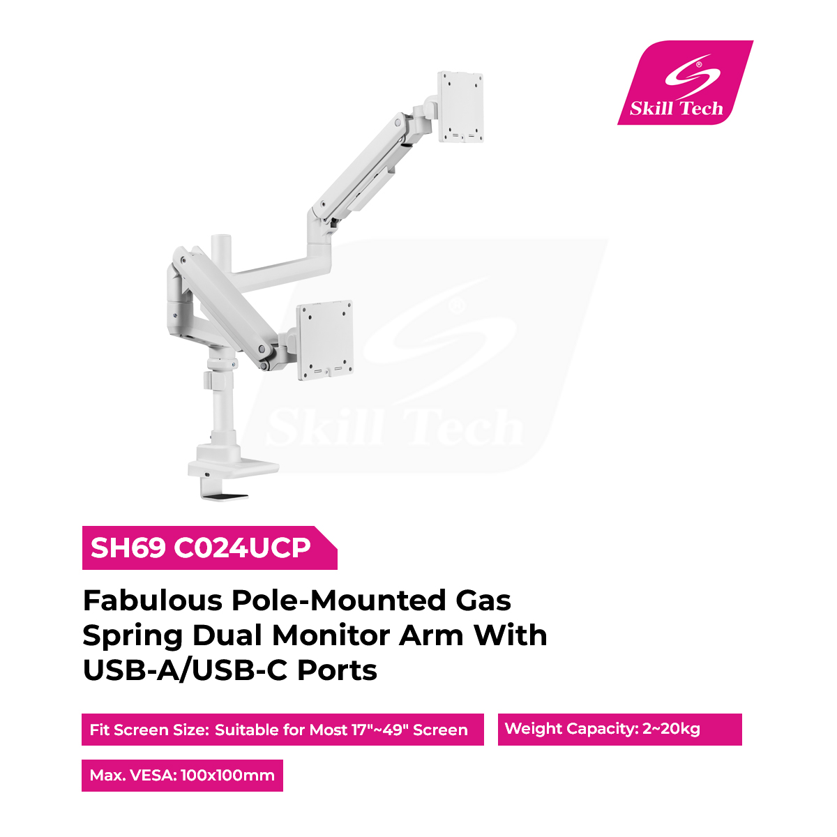The SH69 C024UCP is a premium pole-mounted gas spring dual monitor arm designed for most 17"–49" flat and curved screens (max. VESA 100×100mm). Made from steel, aluminum, and plastic with finishes like polished aluminum, jet black, and fine texture white or black, it supports 2–20kg per screen. Featuring +50° to -20° tilt, ±90° swivel, ±180° rotation, 425mm arm extension, USB-A/USB-C ports, and integrated cable management for a clean workspace.
