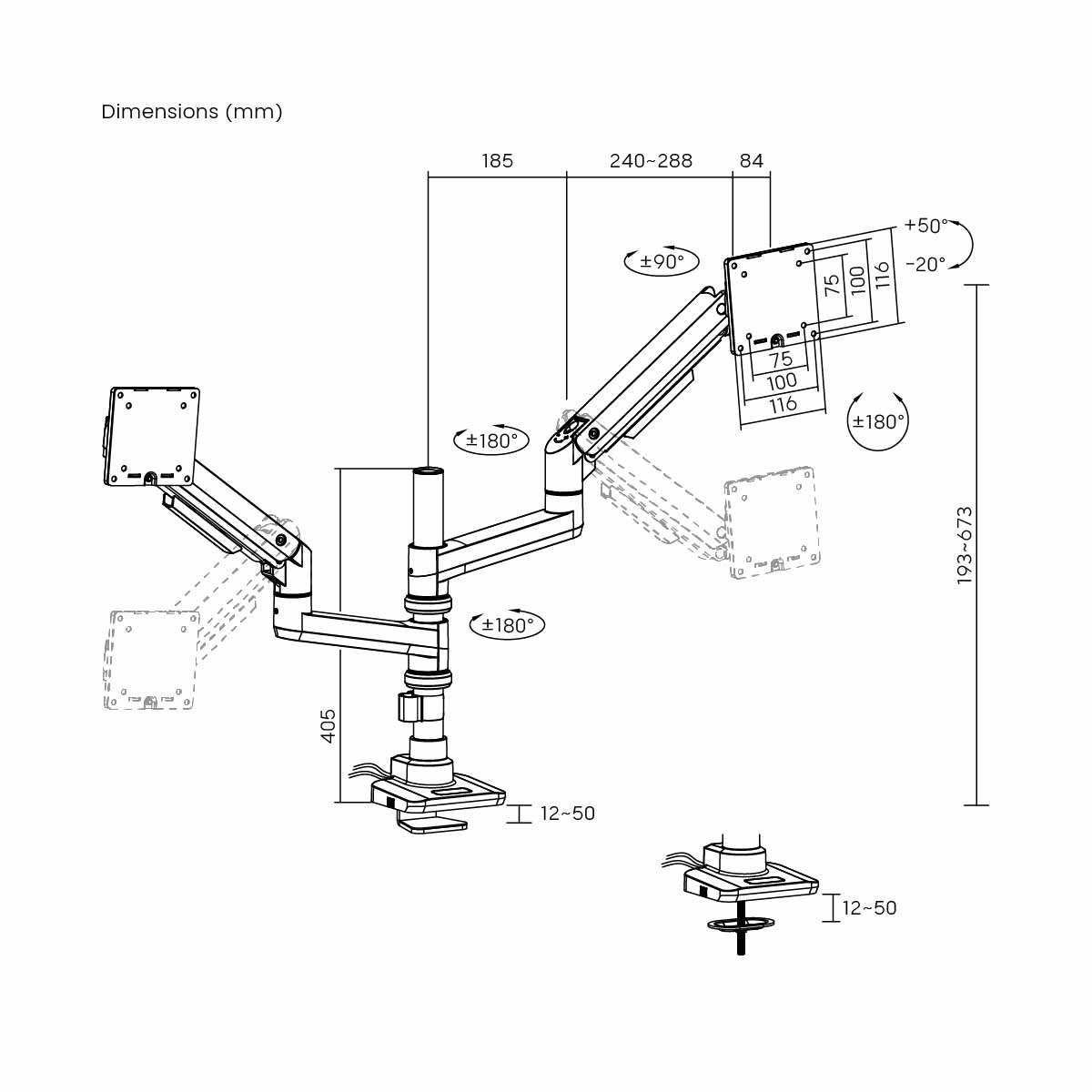 Full Range Motion – +50° to -20° tilt, ±90° swivel, and ±180° rotation for ergonomic viewing.