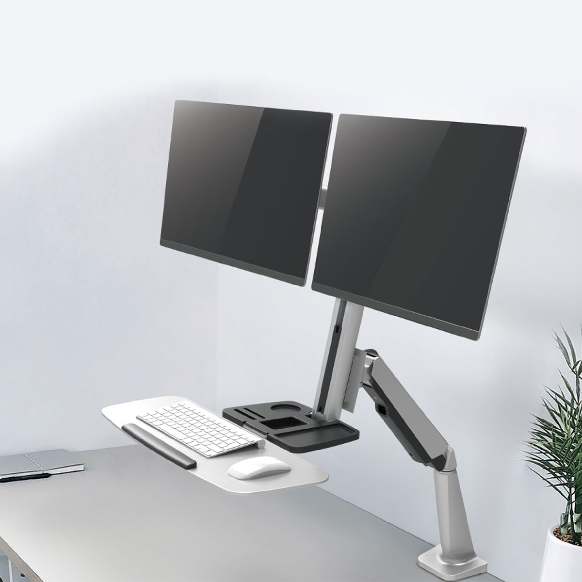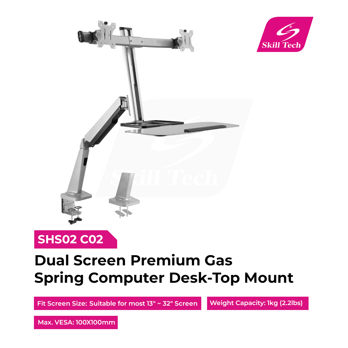The SHS02 C02 Dual Screen Premium Gas Spring Desk-Top Mount is a compact and ergonomic tabletop workstation designed for dual 13″–27″ monitors. With a manual height adjustment range of 20–495mm, it enables smooth sit-stand transitions. Featuring +180° screen rotation, integrated keyboard tray, and a quick-release VESA plate, it offers maximum flexibility. The sturdy aluminum-steel build ensures durability, while clamp or grommet installation supports diverse desk setups.