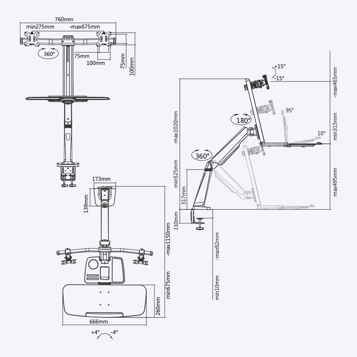 Integrated Keyboard Tray: Spacious 666x260mm surface with 1kg capacity enhances workstation usability.