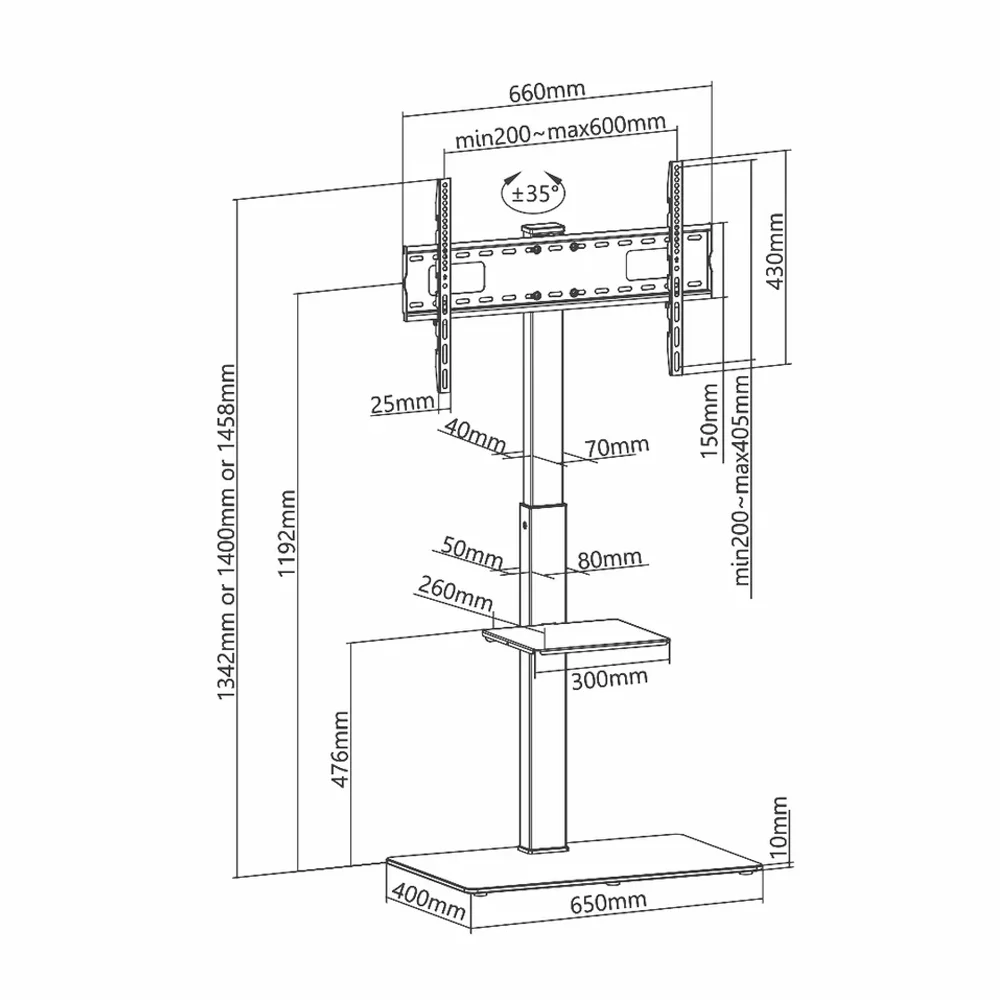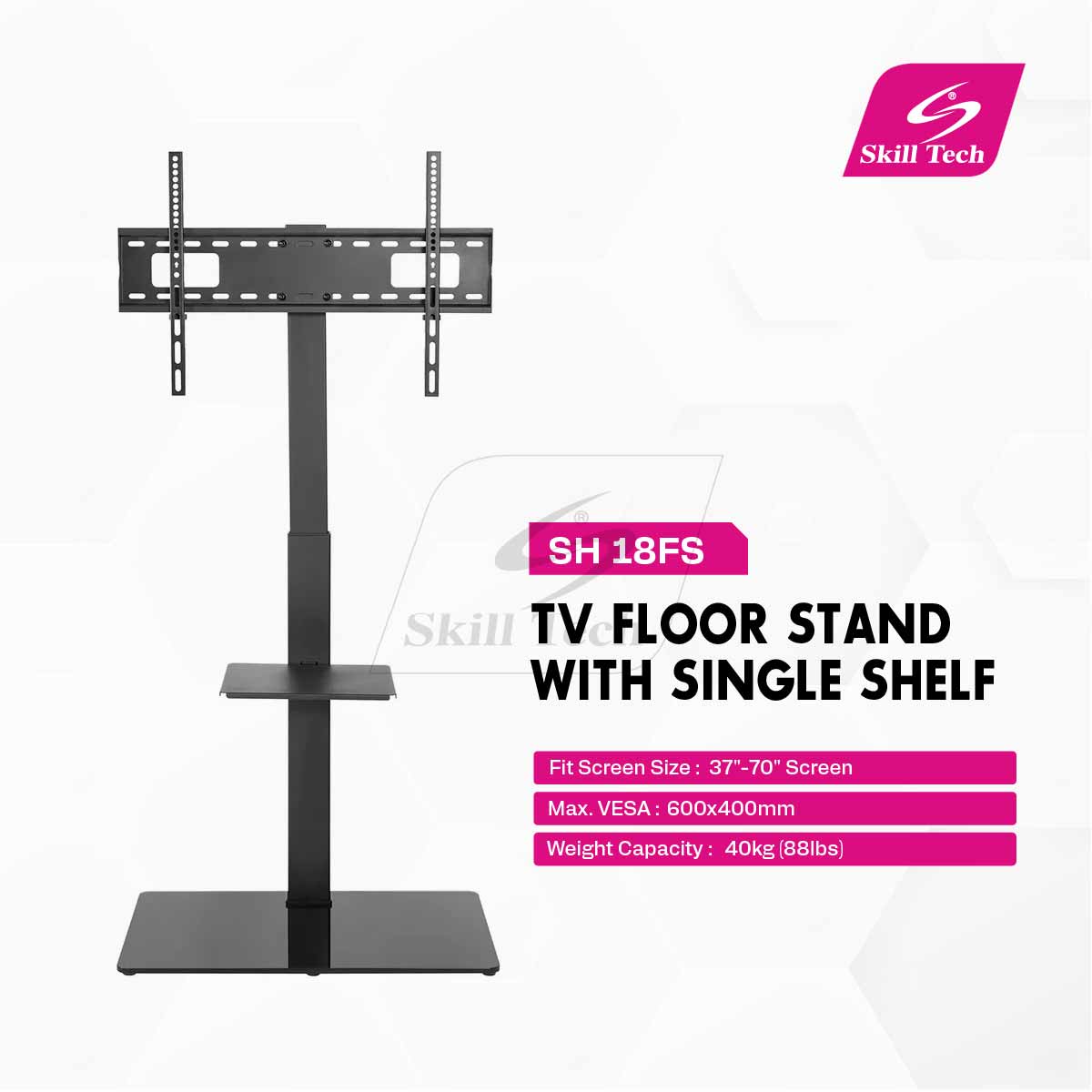 The SH 18FS TV Floor Stand combines sleek design with sturdy construction, ideal for 37" to 70" screens, including curved TVs. Made from steel, plastic, and tempered glass, it features a single shelf, +35° to -35° tilt, and supports up to 40kg (88lbs). The fine texture black finish and built-in cable management offer a clean look. Includes all hardware and instructions for easy setup. VESA compatible up to 600x400mm.