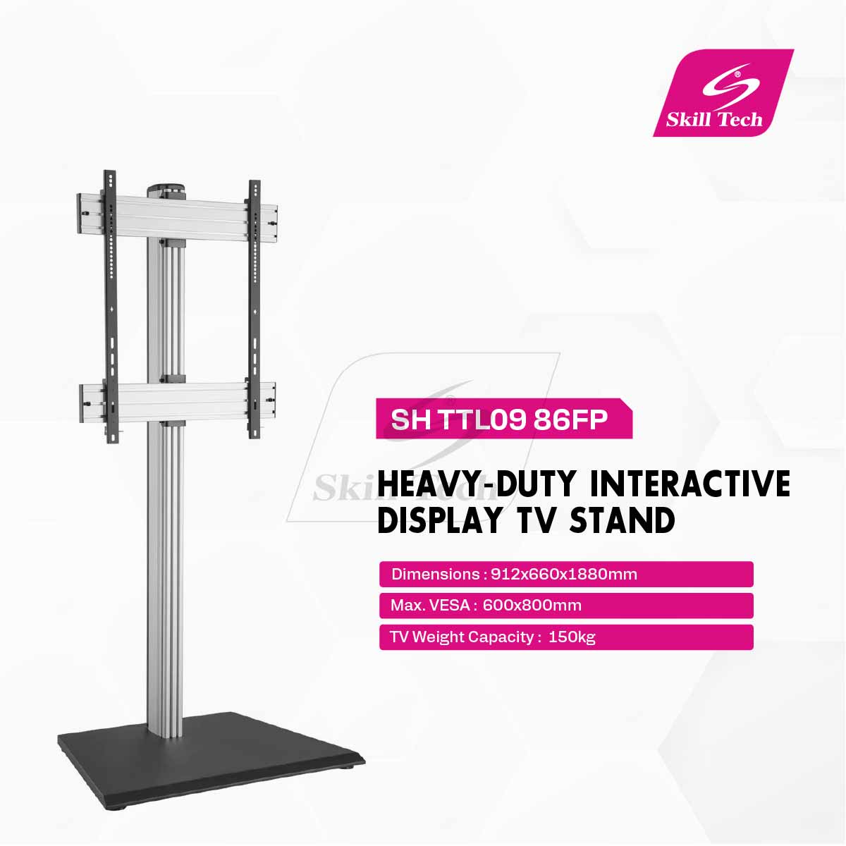 The SH TTL09 86FP is a premium heavy-duty TV stand designed for 60"–100" screens. Built with aluminum, steel, and plastic, it features a robust pedestal base, integrated cable management, and a fine texture grey and matte black finish. With a 150kg weight capacity and max VESA 600x800mm, it’s stability-tested and ideal for interactive displays in professional or educational environments. Direction indicator and sleek design enhance usability and aesthetics.