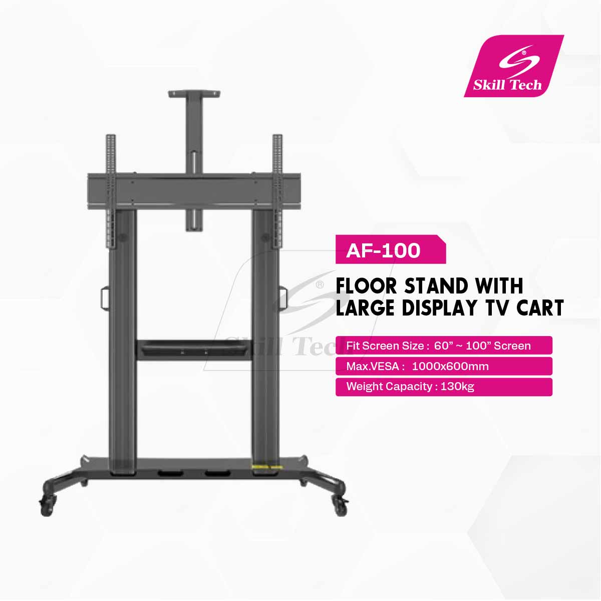 The AF-100 is a heavy-duty floor stand TV cart designed for large displays ranging from 60" to 100". With a robust 130kg load capacity and VESA compatibility up to 1000x600mm, it ensures secure and flexible mounting. Made from 2mm thick aluminum with a powder-coated black finish, it features height adjustment, a built-in DVD shelf, and four heavy-duty casters (2 locking) for smooth mobility and stability. Ideal for professional environments.