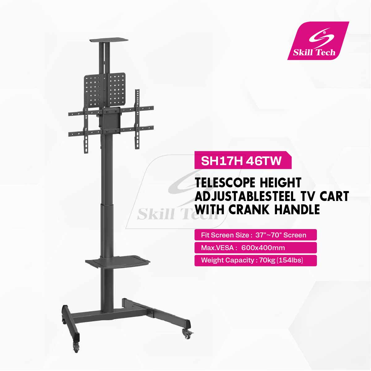 The SH17H 46TW is a crank-adjustable steel TV cart designed for most 37"–70" screens with max. VESA 600×400mm. Finished in matte black powder coating, it supports up to 70kg (154lbs) and is strength tested four times. The crank handle allows smooth 450mm height adjustment, complemented by +5° to -12° tilt and 0°–+90° screen rotation. It also features adjustable shelf height, cable management, and a direction indicator for convenient mobility.