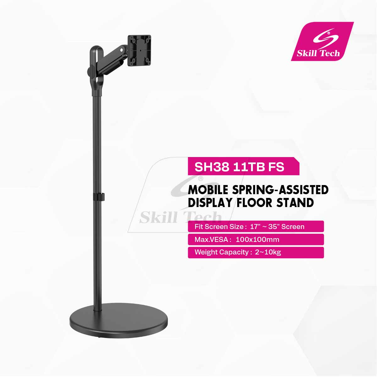The SH38 11TB FS is a freestanding, spring-assisted mobile display floor stand designed for 17"–35" screens. Built with steel, aluminum, and plastic, it supports up to 10kg and features +90°~-90° tilt and rotation. Its sleek matte finish, cable management, and quick-release VESA plate offer both style and convenience. With 180mm arm extension and a 1140mm pole, it's ideal for flexible, ergonomic screen positioning in various environments.