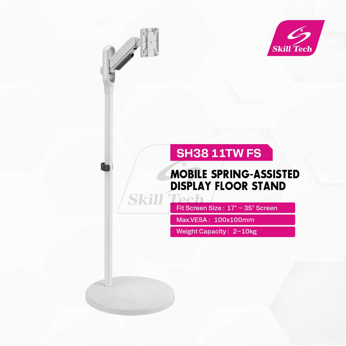 The SH38 11TW FS is a mobile spring-assisted display floor stand designed for most 17" to 35" monitors, with a weight capacity of 2–10kg. Made from steel, aluminum, and plastic with a matte finish, it features a 1140mm pole, 180mm arm extension, and full tilt (+90°~-90°) and rotation (+90°) capabilities. This freestanding unit includes a quick-release VESA plate and integrated cable management for ergonomic positioning and a clean setup.