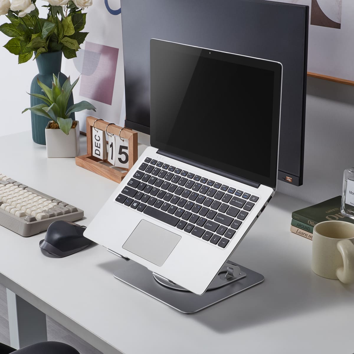 360° Rotating Base – Effortlessly swivel your laptop for better viewing angles and convenience during presentations or multitasking.