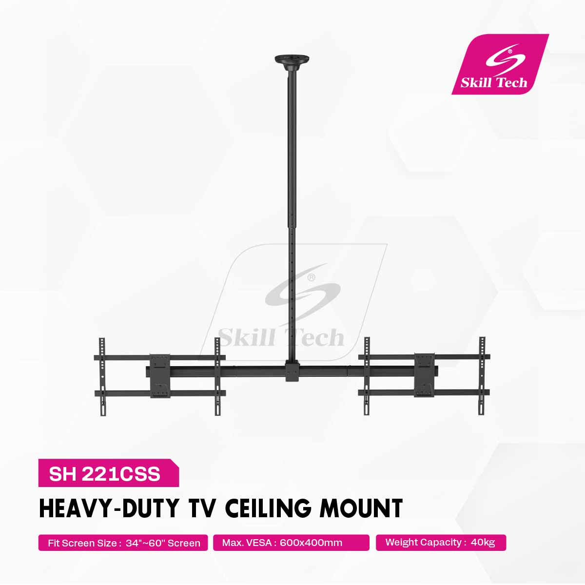 The SH 221CSS heavy-duty TV ceiling mount is ideal for most 34"–60" screens, including curved models. Finished in fine texture black with durable powder coating, it supports up to 40kg per side for reliable strength. Enjoy flexible positioning with a tilt range of 0° to -25°, swivel range of ±180°, and screen leveling of ±3°. Integrated cable management keeps wiring neat, ensuring a clean and organized viewing environment.