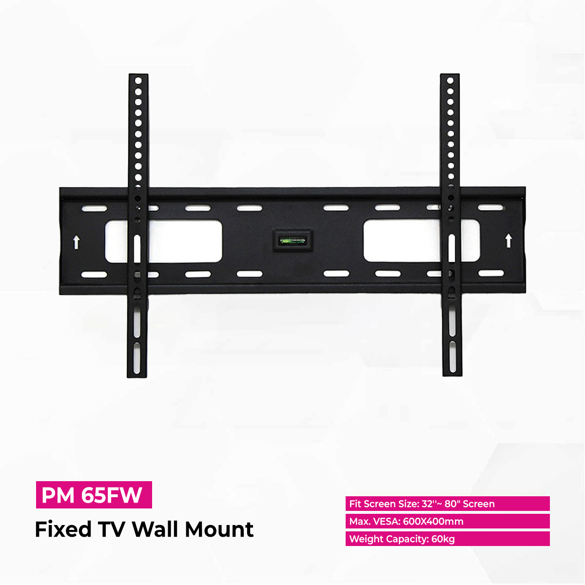 The PM 65FW Fixed TV Wall Mount is designed for stability and style, supporting most 32"~80" flat or curved TVs. Crafted from durable steel with a matte black powder-coated finish, it holds up to 60kg while maintaining a slim 30mm profile. Featuring a detachable panel and fixed wall plate for easy setup, it also includes a convenient hook-on bubble level for precise, hassle-free installation.