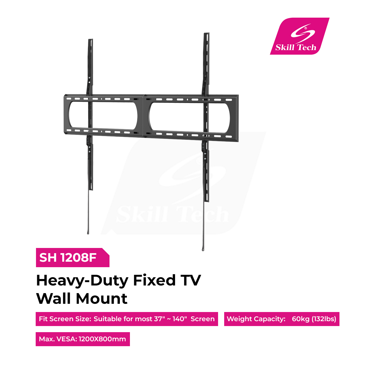 SH 1208F Heavy-Duty Fixed TV Wall Mount is designed for large 37”~140” flat and curved TVs. Constructed from solid steel with a matte black powder-coated finish, it supports up to 125kg for maximum strength and stability. The ultra-slim 32mm profile delivers a clean, low-profile look. Featuring universal VESA compatibility up to 1200x800mm, a detachable panel, and included hook-on bubble level, it ensures quick, precise, and secure installation.