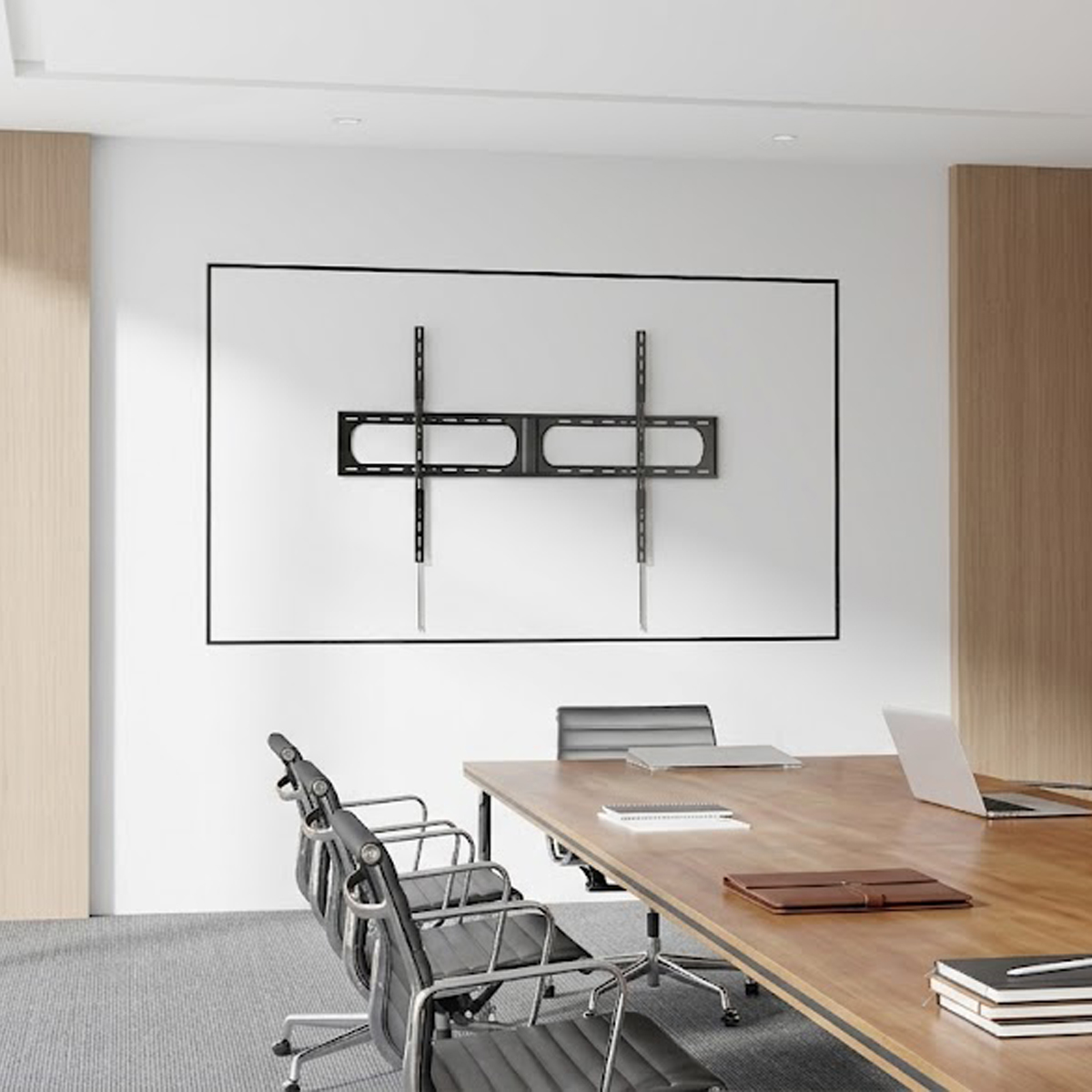 Supports VESA patterns up to 1200x800mm and includes a detachable panel and hook-on bubble level for quick and precise mounting.