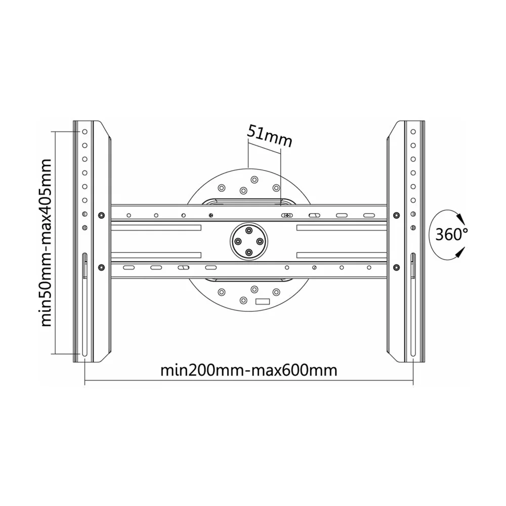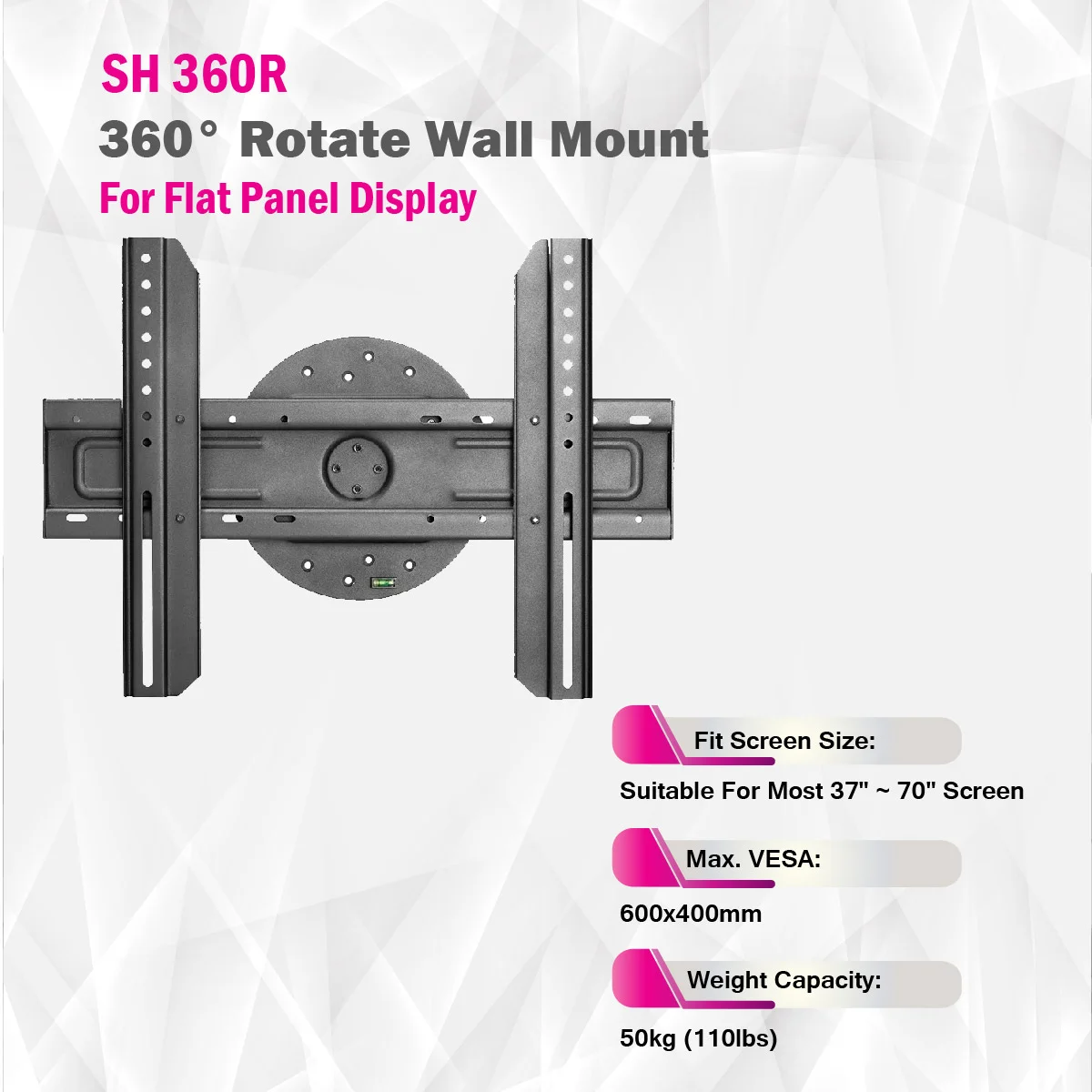 The SH 360R is a 360° rotating TV wall mount designed for 37"~70" flat panel displays. Built from durable steel and plastic with a fine texture black powder-coated finish, it supports up to 50kg (110lbs). Its ultra-slim 51mm profile and built-in bubble level ensure easy, precise installation. Compatible with VESA up to 600x400mm, it features a detachable panel and fits solid wall or single stud setups for versatile digital signage mounting.