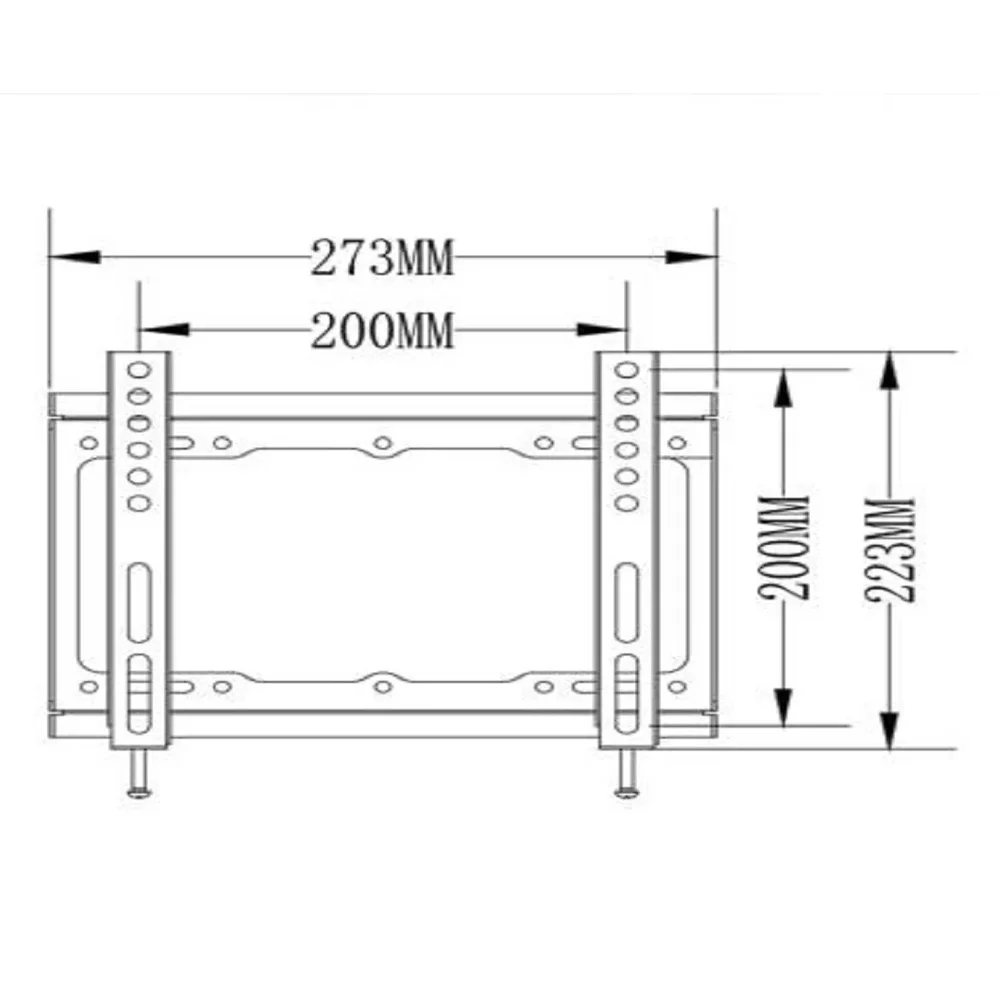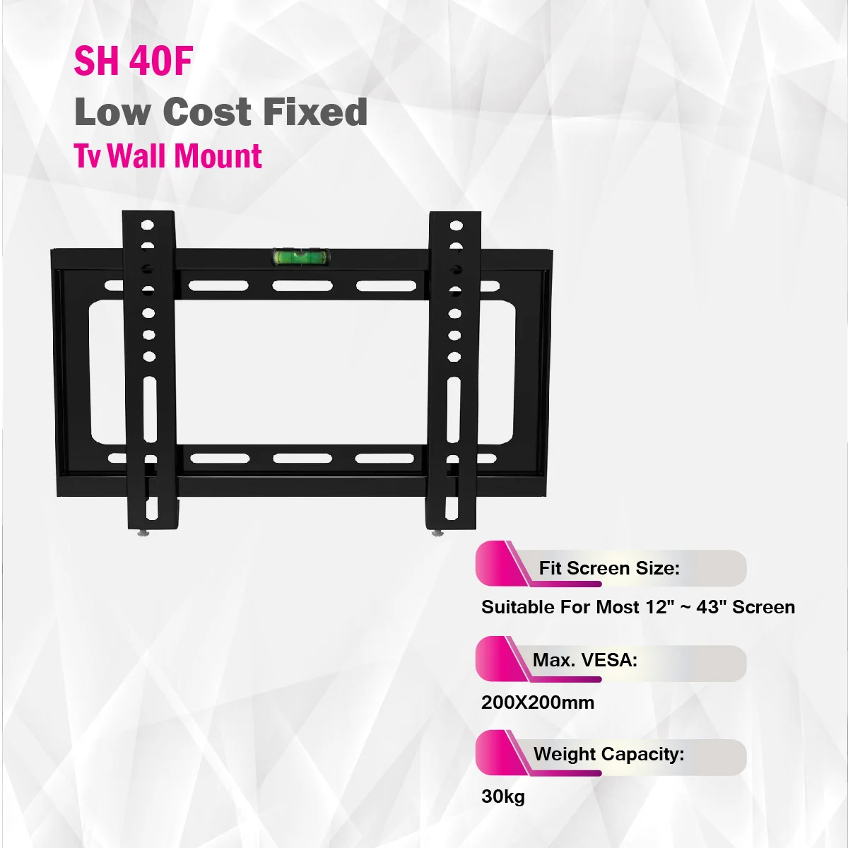 The SH 40F Low Cost Fixed TV Wall Mount is a sturdy steel mount with a matte black powder-coated finish, designed for most 12"~43" screens, including curved TVs. It supports VESA patterns up to 200x200mm and holds up to 30kg, strength tested three times. With a 30mm low-profile design, detachable panel, and fixed wall plate, it includes a hook-on bubble level and compartment polybag for easy installation.