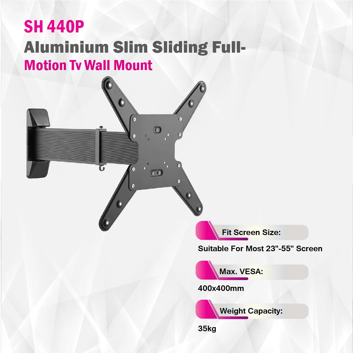 The SH 440P Aluminium Slim Sliding Full-Motion TV Wall Mount is a premium solution designed for 23"~55" TVs, including curved screens. Made from steel and aluminum, it supports up to 35kg and offers smooth tilt +8°~ -12°, Swivel +90°~-90°, and level adjustments. With a slim 45~680mm profile, integrated cable management, and VESA compatibility up to 400x400mm, it ensures secure, flexible mounting with a sleek, professional look.