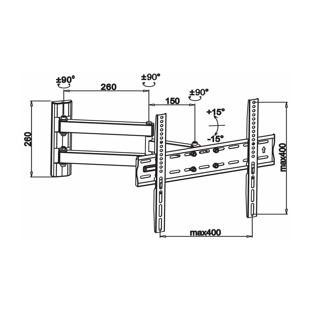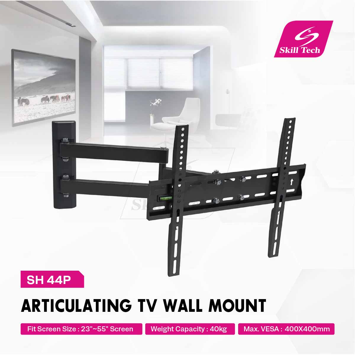 The SH 44P Articulating TV Wall Mount is an economical and functional solution for mounting most 23"~55" flat or curved TVs. Built from durable steel and plastic with a matte black finish, it supports up to 40kg and VESA patterns up to 400x400mm. It features a tilt range of +5°~-12°, a 70~480mm profile, and includes a detachable panel, bubble level, and zip polybag for easy installation.
