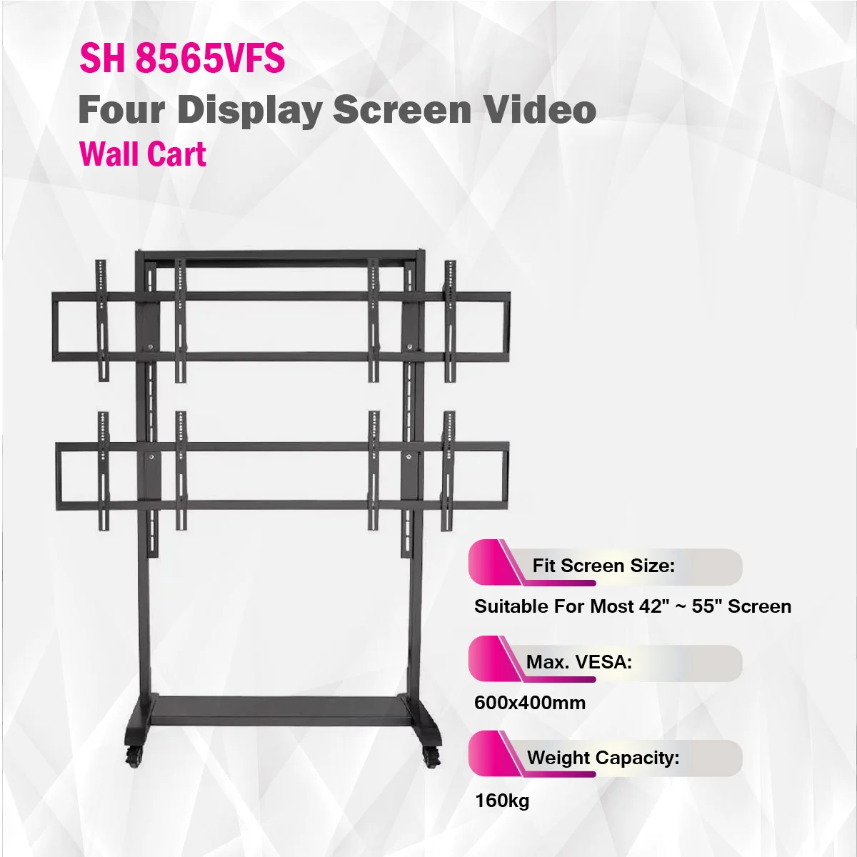 The SH 8565VFS Four Display Video Wall Cart is a sturdy, bolt-down solution designed for 2x2 screen configurations (42"–55"). Built with 2mm cold-rolled steel and finished in fine texture black, it supports up to 160kg total. Features include ±2° tilt, 10–20mm fine adjustment, integrated cable management, and a direction indicator. Ideal for professional environments, it ensures stable, precise display alignment with safety-tested mobility and organized installation accessories.