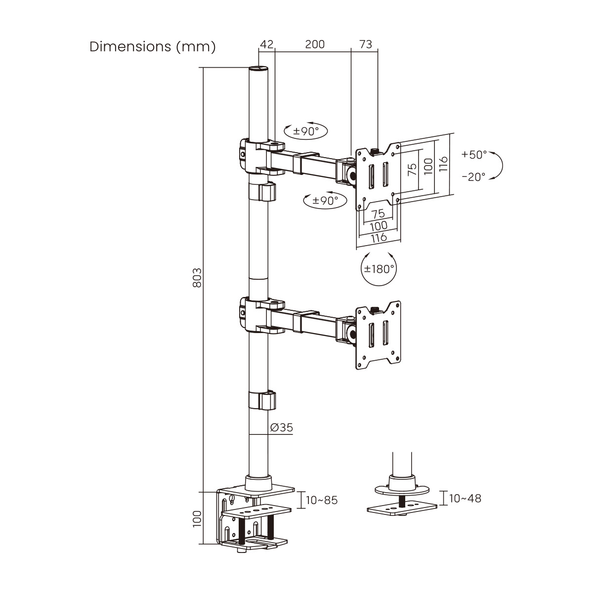 | Suggested Desktop Thickness: | Clamp:10~85mm Grommet:10~48mm (Clamp:0.39"~3.3" Grommet:0.39"~1.9") |