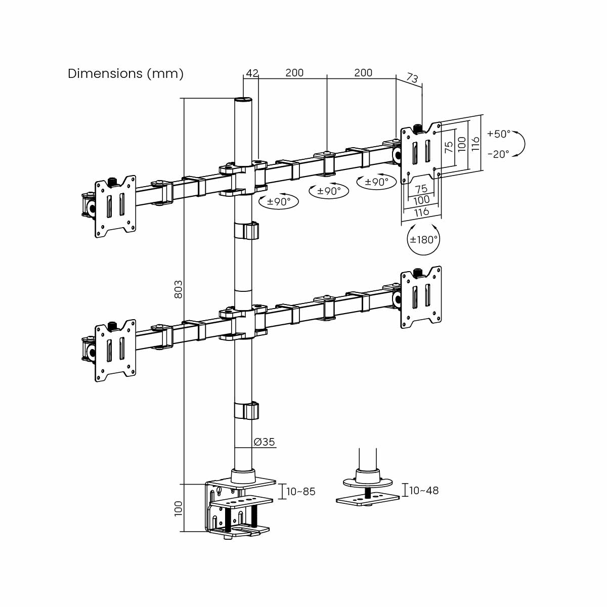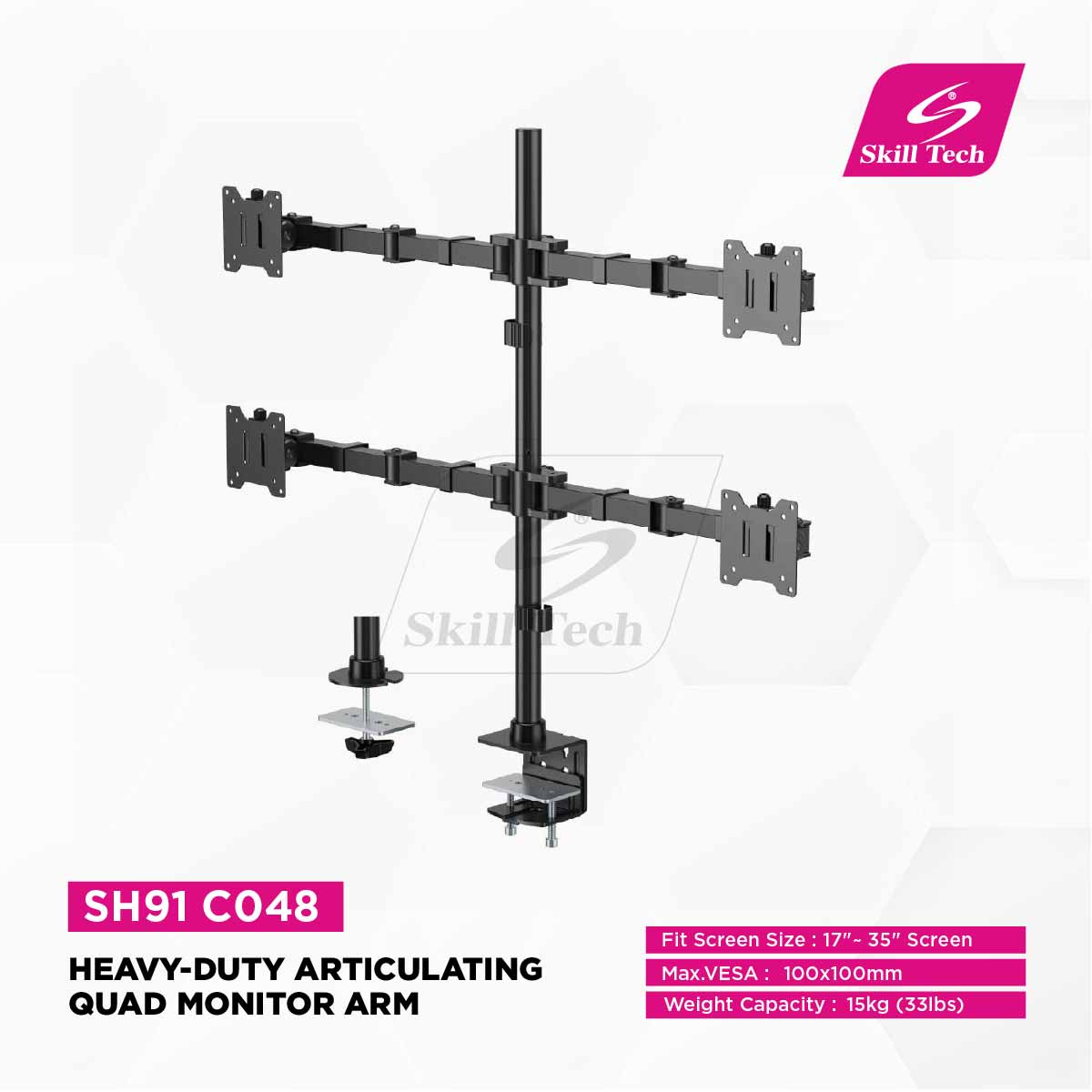 The SH91 C048 articulating monitor arm holds four 17″–35″ screens (max. VESA 100×100mm), each supporting up to 15kg (33lbs). Built from steel, aluminum, and plastic with a matte black powder-coated finish, it offers +50° to -20° tilt, ±90° swivel, and ±180° rotation. Features a 442mm (17.4″) arm extension, tall 803mm (31.6″) pole, quick release VESA plates, clamp or grommet installation, and integrated cable management for a tidy, ergonomic workspace.
