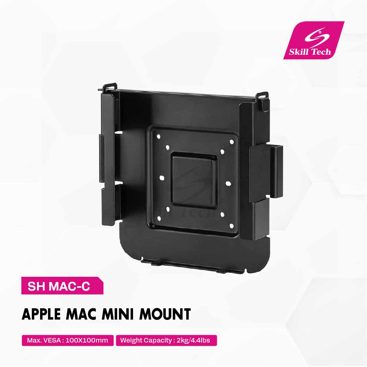 The SH MAC-C is a dedicated Apple Mac mini mount crafted from durable SPCC cold rolled steel (thickness 1.88mm). Designed specifically for the Mac mini M1, it supports a weight capacity of up to 2kg (4.4lbs). With a sleek matte black or matte white finish, it features a max. VESA compatibility of 100×100mm, allowing flexible mounting options to keep your workspace clean, organized, and professional-looking.