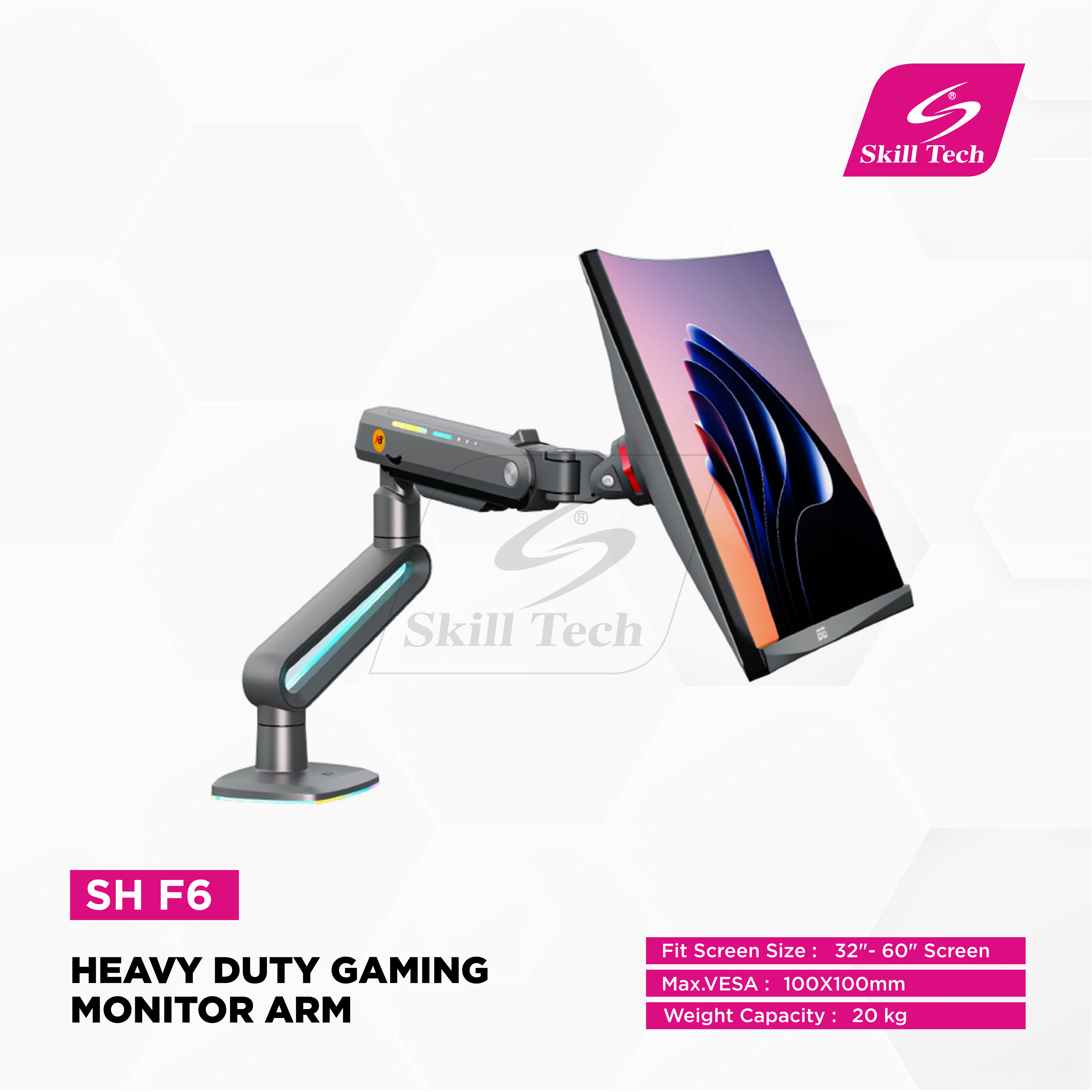 The SH F6 Heavy-Duty Gaming Monitor Arm is a premium solution designed for gamers and professionals seeking flexibility and durability. Constructed from steel, aluminum, and plastic with a powder-coated finish, it supports most 32"~60" flat and curved monitors up to 20kg. Offering tilt +50° ~ -50°, swivel +90° ~ -90°, and full 360° rotation, along with 260mm lift and 620mm extension, it ensures ergonomic positioning. Quick-release VESA plates and integrated cable management provide a clean, organized setup.