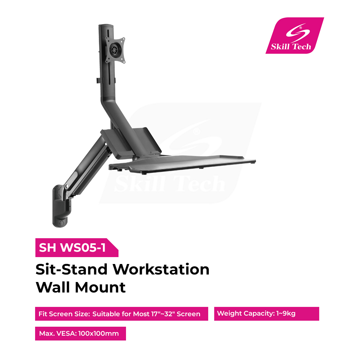 The SH WS05-1 Sit-Stand Workstation Wall Mount is a space-saving ergonomic solution designed for modern workspaces. Built with durable steel, aluminum, and plastic, it supports 17"~32" monitors up to 9kg. With smooth tilt, swivel, and 180° rotation, it ensures comfortable viewing. The 515mm manual height adjustment allows easy sit-stand transitions, while the integrated keyboard tray and quick-release VESA plate add convenience and efficiency.