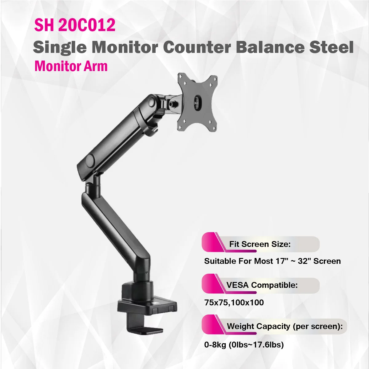 The SH20 C012 Single Monitor Counter Balance Arm is a premium mechanical spring monitor mount designed for 17" to 32" screens, including curved models. Crafted from aluminum, steel, and plastic with a matte black powder-coated finish, it supports up to 8kg. Enjoy full motion adjustability with ±90° tilt, swivel, and rotation. With 467mm arm extension, integrated cable management, and both clamp and grommet installation options, it's ideal for ergonomic, space-saving setups.