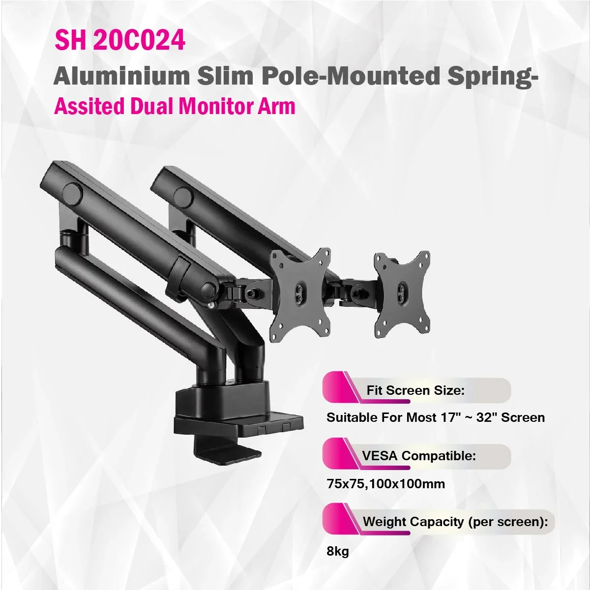 The SH20 C024 Aluminium Slim Pole-Mounted Spring-Assisted Dual Monitor Mount offers a sleek and sturdy solution for dual-screen setups. Designed for most 17" to 32" monitors, including curved displays, it supports up to 8kg per screen. With full tilt, swivel, and rotation capability, users can enjoy ergonomic comfort and flexible positioning. Its mechanical spring system ensures smooth adjustments, while the slim profile and matte black finish enhance both function and style on any desk.