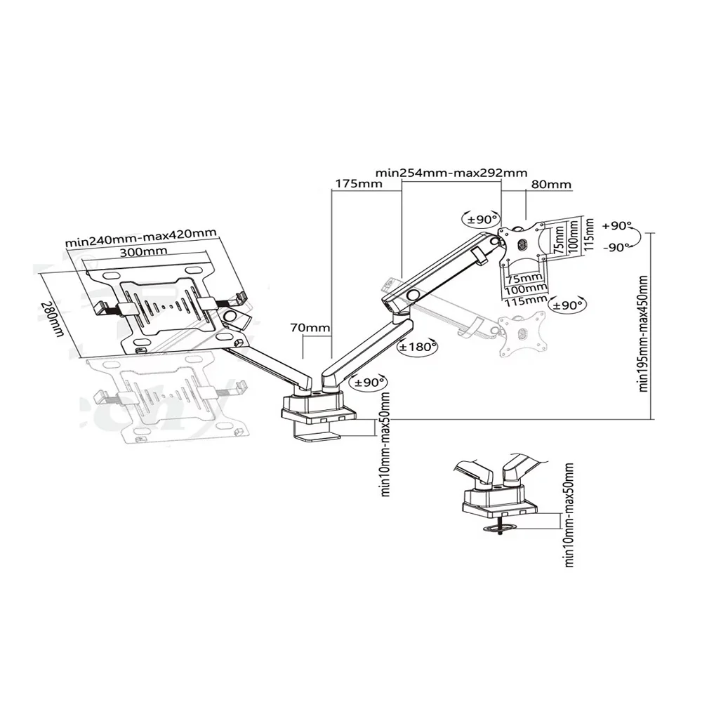 Extended Reach & Motion: With a 467mm (18.4") arm extension, it offers wide positioning flexibility for both monitor and laptop.