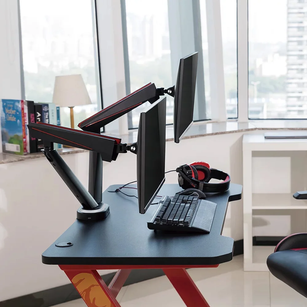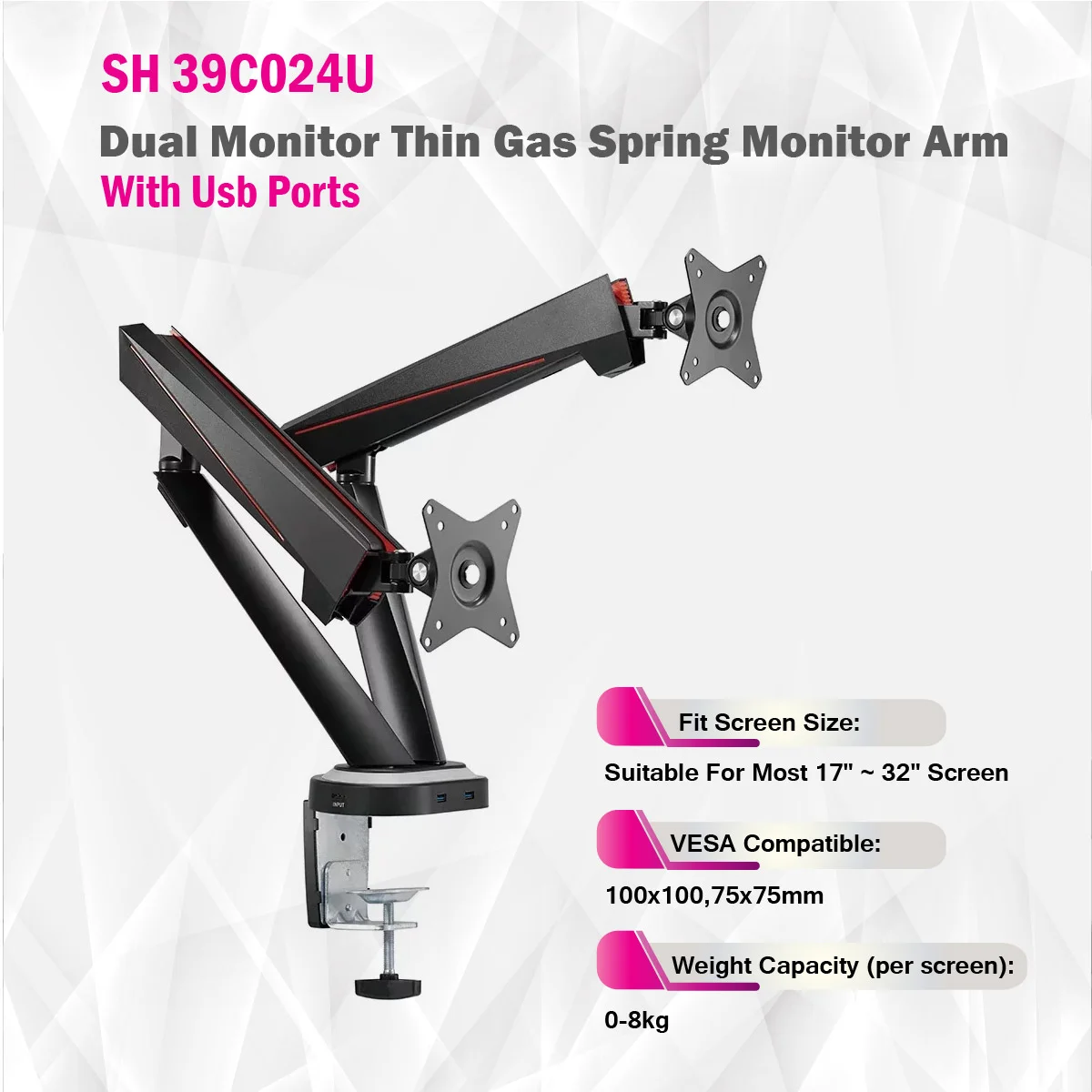 The SH39 C024U Dual Monitor Thin Gas Spring Monitor Arm is a premium-grade solution designed for pro gamers and professionals. Supporting two 17″–32″ flat or curved monitors, each up to 8kg, it provides +40° to -40° tilt, ±90° swivel, and full ±180° rotation. Built with durable steel, aluminum, and plastic, it features USB ports, smooth gas spring movement, and clean cable management for an optimal, clutter-free workspace.
