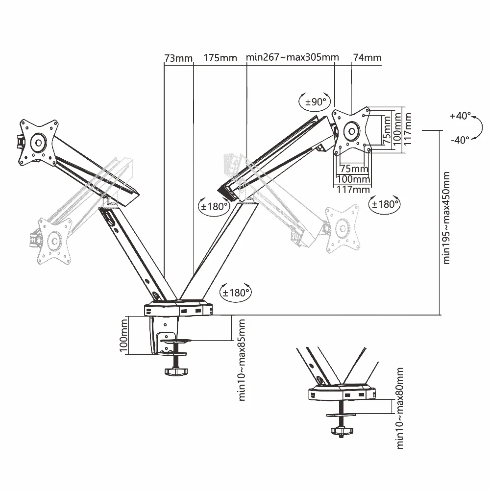 Extended Arm Reach – Features an 480mm arm extension to provide wide and versatile monitor placement.