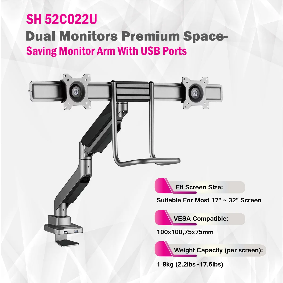 The SH52 C022U Dual Monitors Premium Space-Saving Monitor Arm offers an efficient and sleek solution for dual-screen setups. Designed for 17"–32" monitors, including curved displays, it supports up to 8kg per screen. Featuring smooth tilt, swivel, and 180° rotation, it ensures ergonomic viewing angles. With integrated cable management and dual USB 3.0 ports, this space-grey arm combines style, functionality, and workspace organization in one premium package.