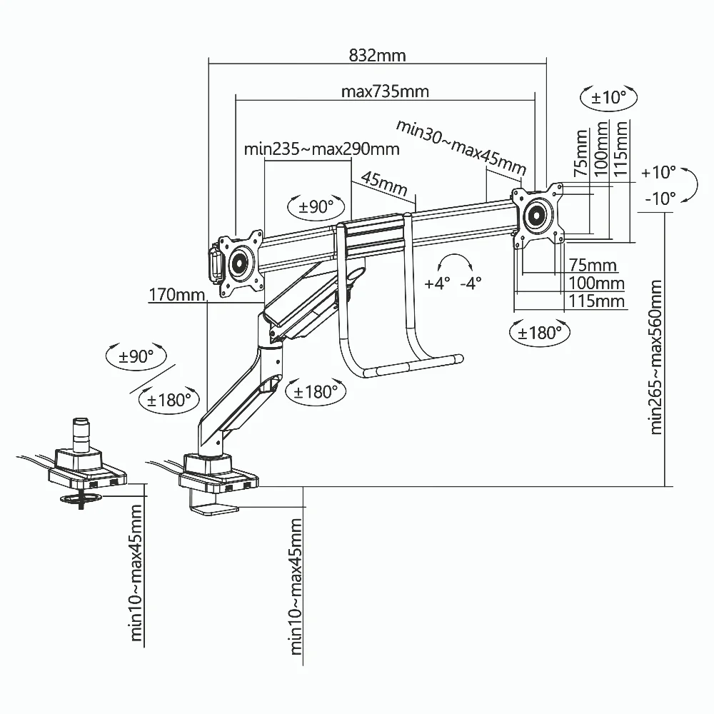 Suggested Desktop Thickness: | Clamp 10~45mm Grommet 1045mm (Clamp 0.39"~1.8" Grommet 0.39"~1.8") |
