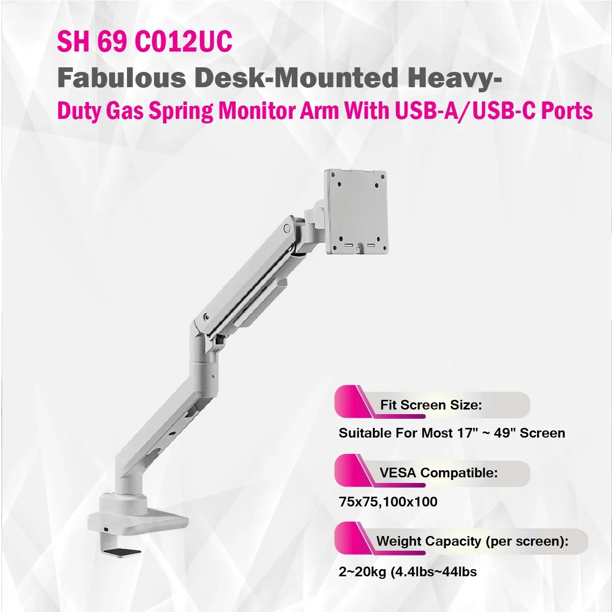 The SH69 C012UC is a premium heavy-duty desk-mounted gas spring monitor arm designed for ultimate flexibility and durability. Compatible with most 17"–49" flat and curved monitors, it supports up to 20kg per screen and offers full motion with tilt, swivel, and 180° rotation. Featuring polished aluminum construction, USB-A and USB-C ports, quick-release VESA, and built-in cable management, it combines sleek design with powerful performance for modern workspaces.