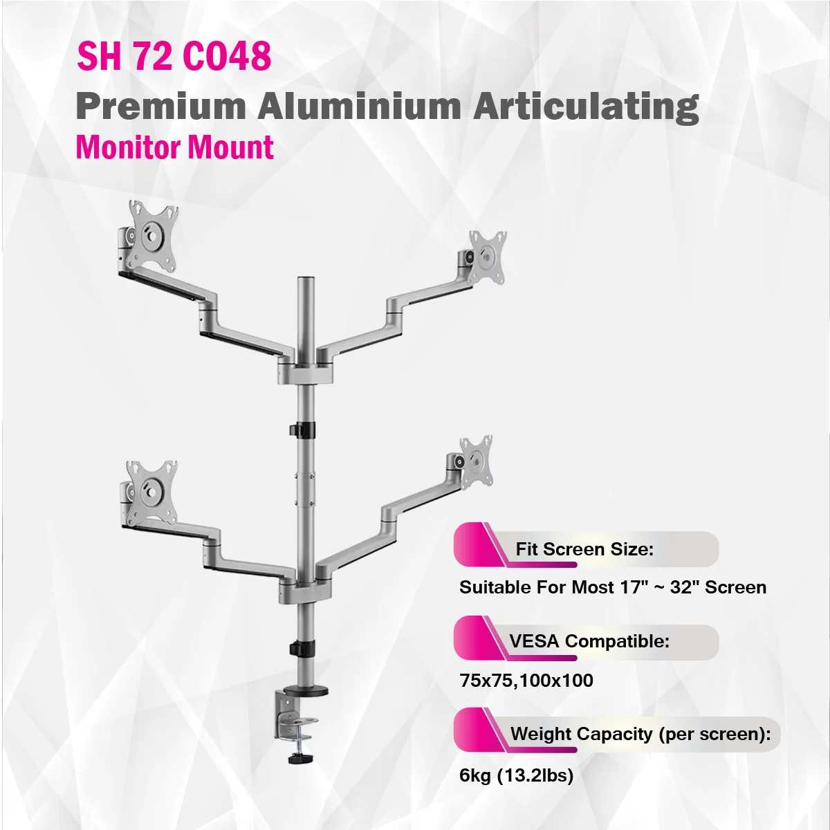 The SH72 CO48 is a premium aluminium articulating monitor mount designed for up to four screens sized 17" to 32". Featuring a sturdy powder-coated finish in matte black or silver, it supports 6kg per screen with flexible tilt (+90° to -30°), swivel (+90° to -90°), and rotation (+180° to -180°). The arm extends up to 447mm, with easy clamp or grommet installation and built-in cable management for a clean setup.