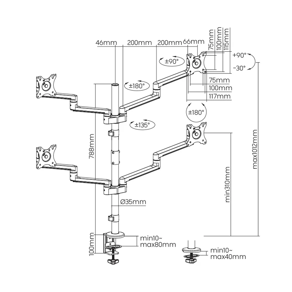 | Suggested Desktop Thickness: | Clamp:10~80mm Grommet: 10~40mm (Clamp: 0.39"~3.1" Grommet:0.39"~1.6") |