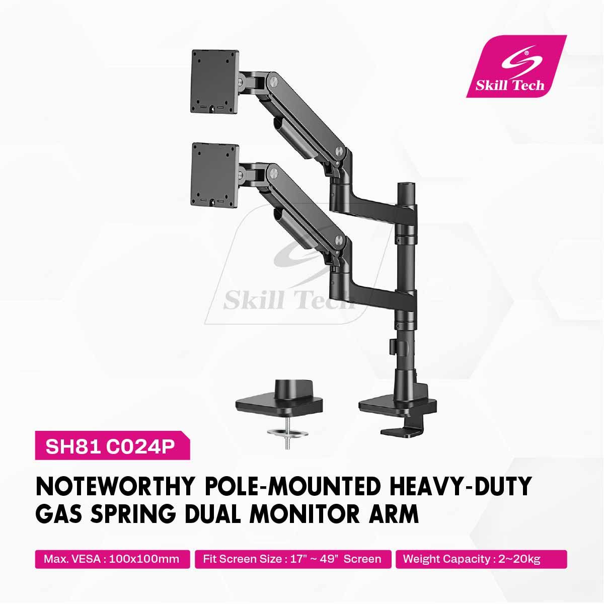 The SH81 C024P is a premium, heavy-duty pole-mounted gas spring dual monitor arm designed for 17"–49" screens, including curved displays. Built with steel, aluminum, and plastic, it supports up to 20kg per screen. Enjoy full motion flexibility with +50° to -20° tilt, ±90° swivel, and 180° rotation. Its 482mm arm extension and integrated cable management offer ergonomic comfort and workspace organization. Clamp or grommet installation fits desktops 12–50mm thick.