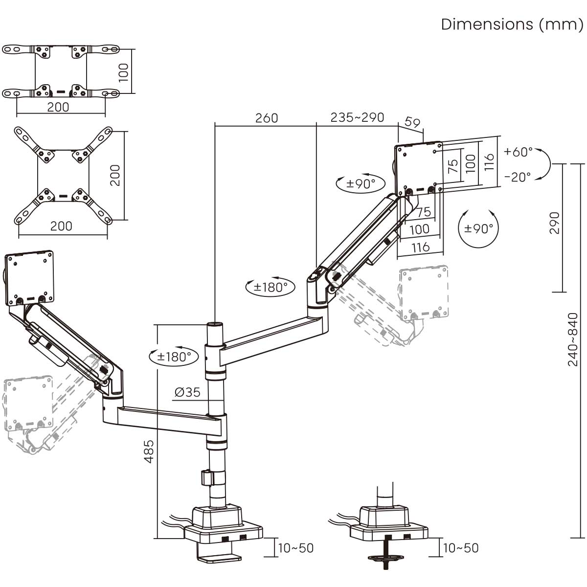 Suggested Desktop Thickness: | Clamp:10~50mm Grommet:10~50mm (Clamp:0.39"~2" Grommet:0.39"~2") |