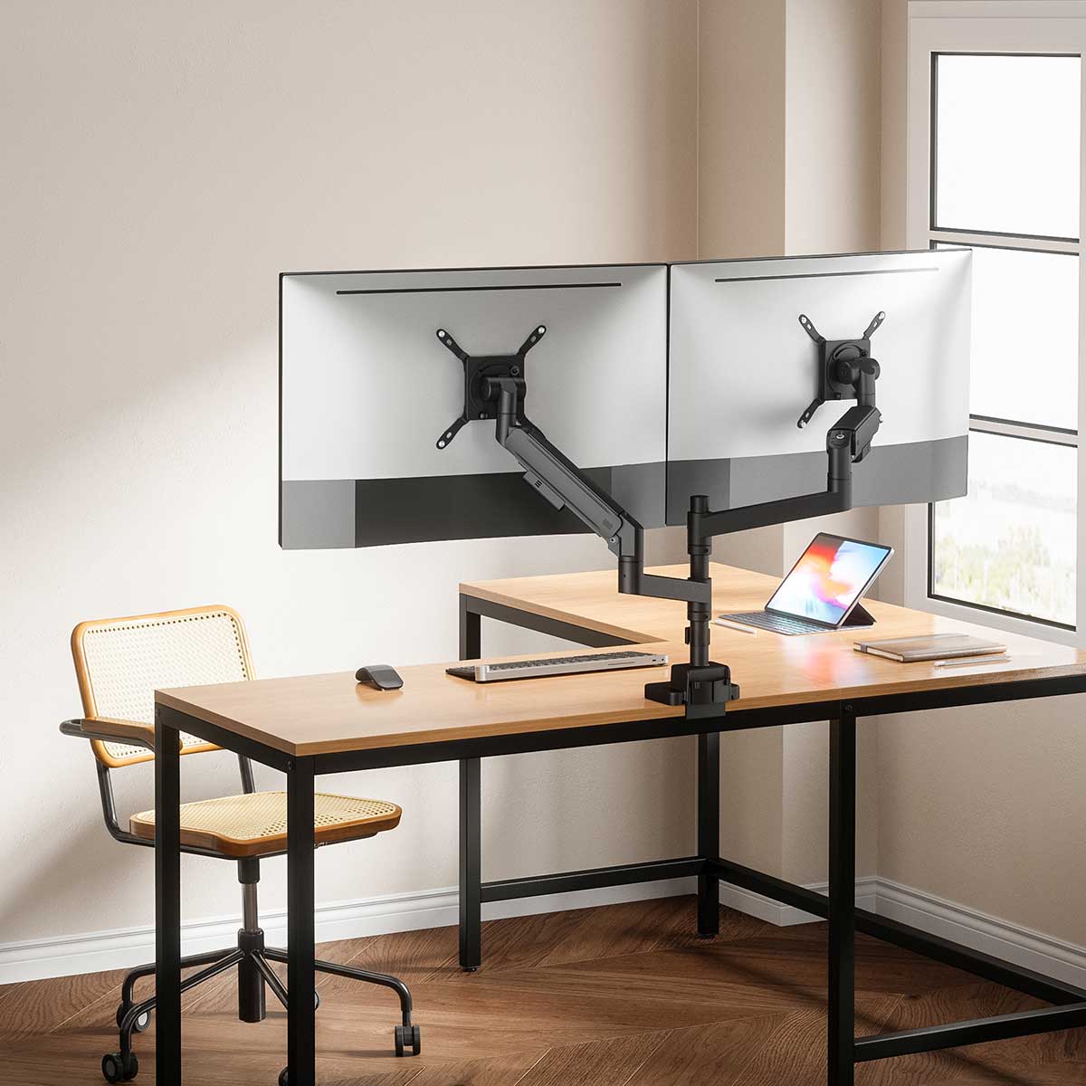 Ergonomic Mounts, Ergonomic, Mounts, Gas Spring Monitor Arm, Monitor Arm, Gas Spring Monitor Arm in uae, Gas Spring Monitor Arm in dubai, Best Gas Spring Monitor Arm, Titan Heavy-Duty Pole-Mounted Gas Spring Dual Monitor Arm With USB-A And USB-C Ports