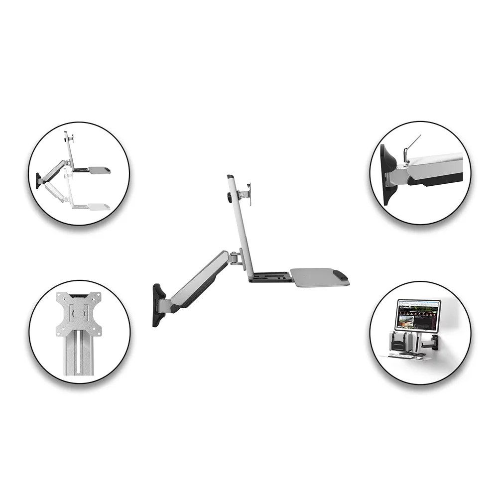 The SHS 02W01 is a premium wall-mounted gas spring computer monitor mount designed for efficient workspaces. Suitable for 13″–32″ screens, it supports up to 8kg and offers full tilt, swivel, and 180° rotation. Featuring a spacious 666x260mm work surface and a stable keyboard tray, it allows manual height adjustment up to 505mm. Crafted from steel, aluminum, and plastic, this mount ensures ergonomic comfort and durability with clean cable management.
