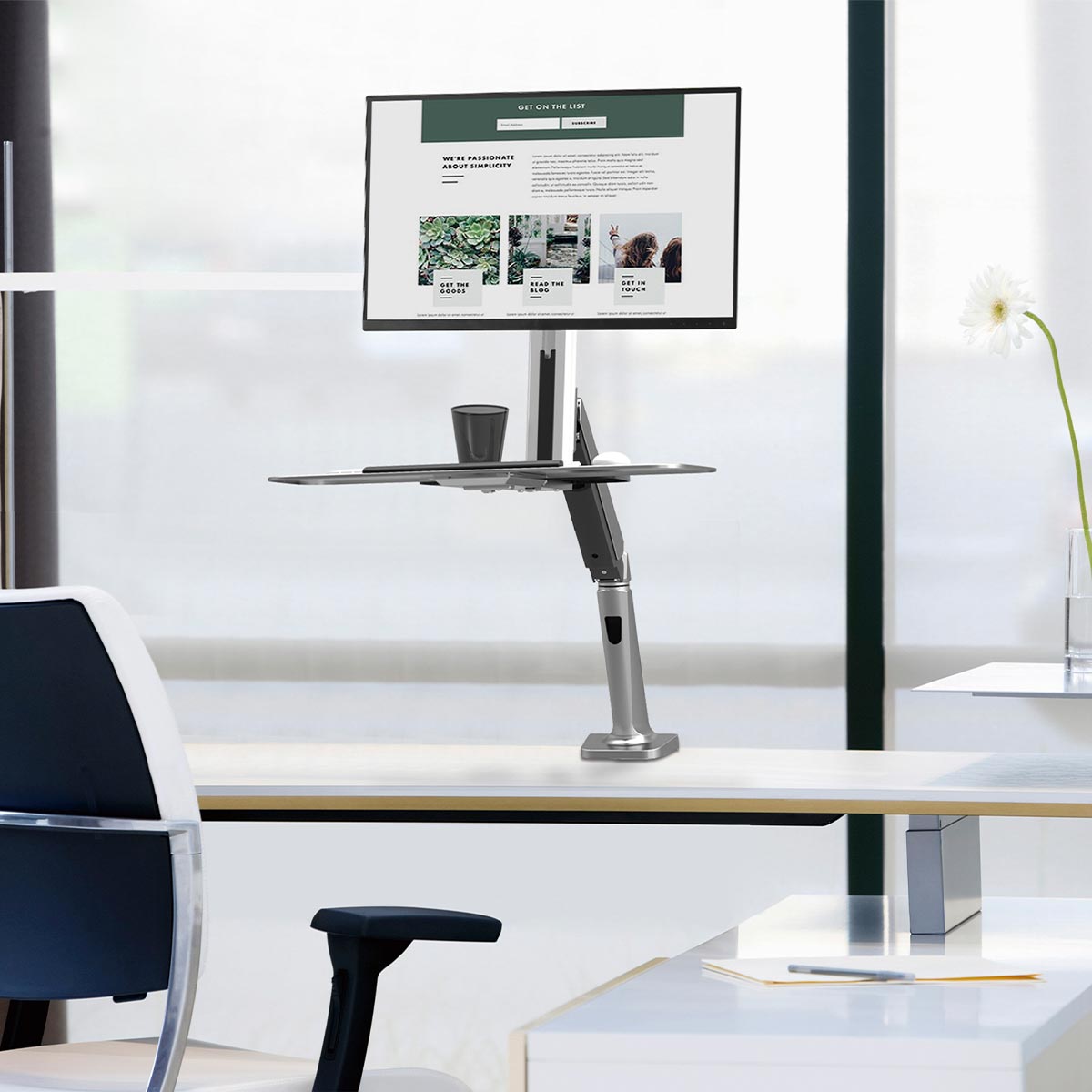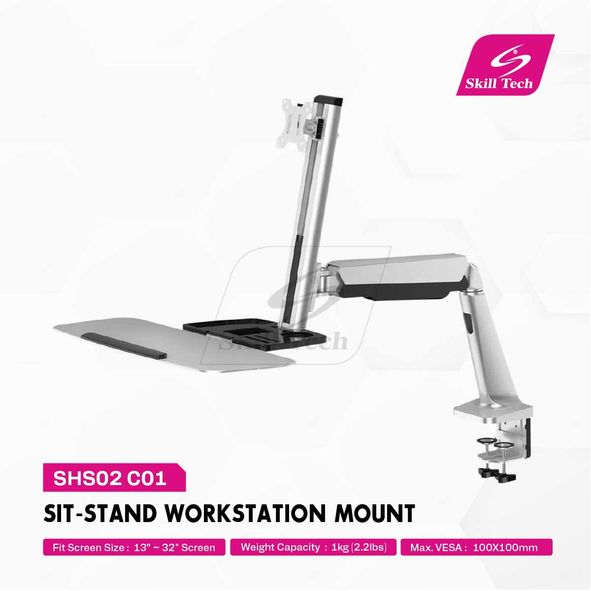 The SHS02 C01 Sit-Stand Workstation Mount offers ergonomic flexibility for modern workspaces, supporting most 13"~32" monitors up to 8kg. Constructed from steel, aluminum, and plastic in a sleek silver finish, it provides a 20~495mm height range and smooth tilt, swivel, and 360° rotation adjustments. The integrated keyboard tray and manual height control enhance comfort and productivity, while the clamp and grommet installation ensure stability and easy setup.