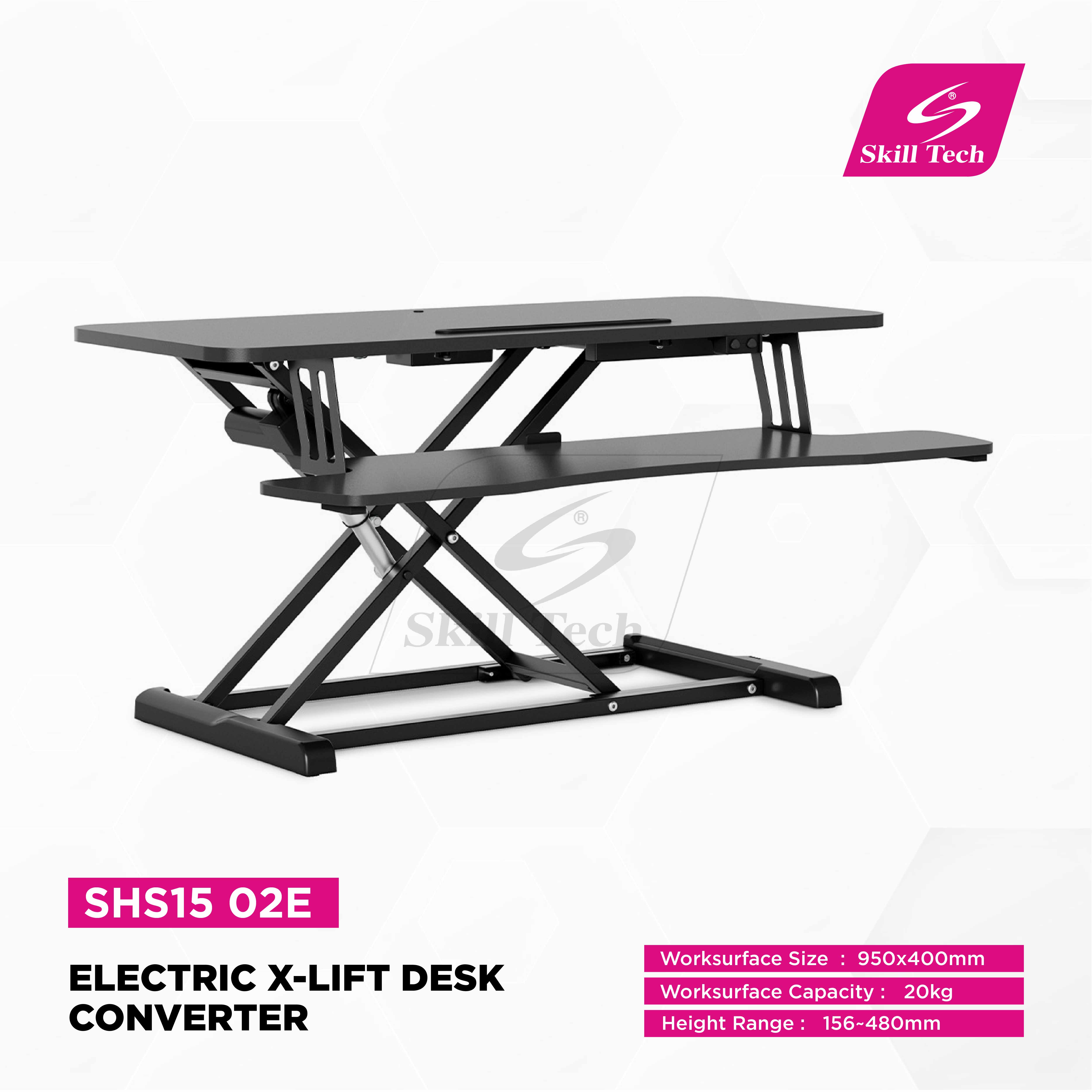 The SHS15 02E Electric X-Lift Desk Converter is a premium tabletop workstation designed for comfort and productivity. Featuring a sturdy particle board surface with melamine finish and a steel frame in black and matte black, it supports up to 20 kg. With an electric height adjustment range of 156–480 mm, it easily adapts to sitting or standing positions. The spacious worksurface and keyboard tray provide ample space, while its freestanding design ensures hassle-free setup.