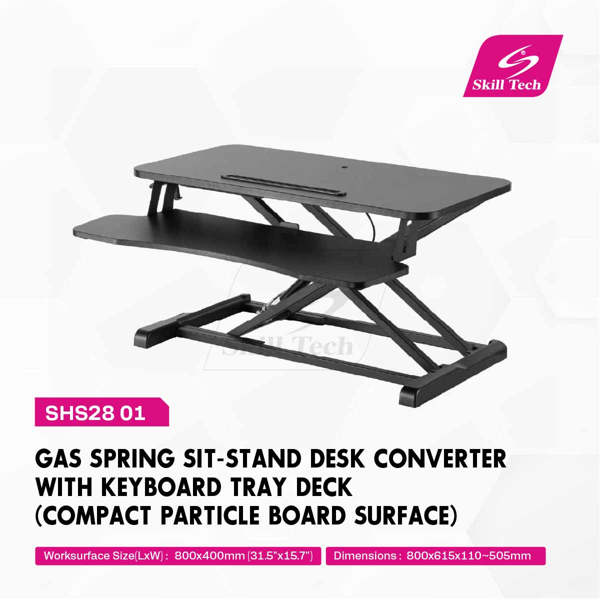 The SHS28 01 is a standard gas spring sit-stand desk converter featuring a compact particle board surface with melamine finish in black and matte black. It offers an adjustable height range of 110–505mm (4.3"–19.9") and supports up to 15kg (33lbs) on its 800×400mm worksurface. The integrated 795×300mm keyboard tray holds up to 2kg (4.4lbs). Freestanding installation ensures easy setup, and silk screen printing is available for customization.