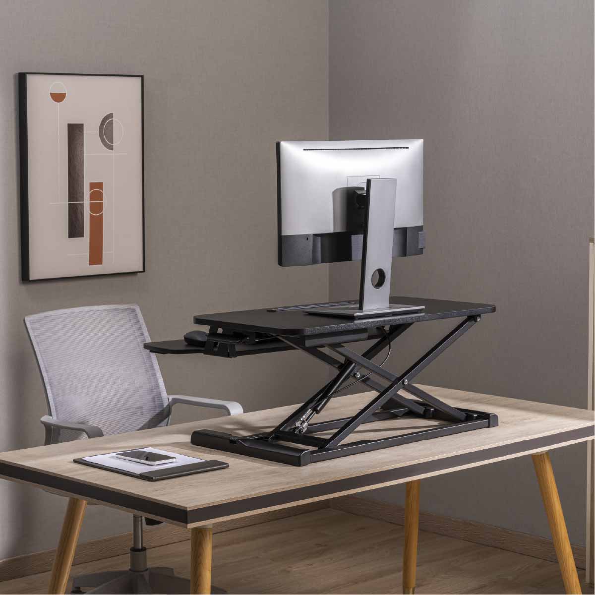Standing Desk Converter, Standing Desktop Converter, Stand Up Desk Converter, Ergonomic Workstation, Desktop Sit-Stand Workstation, Sit-Stand Desk Converter, Gas Spring Desk Converter, Spring 2021-Lumi Ergo, Gas Spring Sit-Stand Desk Converter with Keyboard Tray Deck (Compact Particle Board Surface)