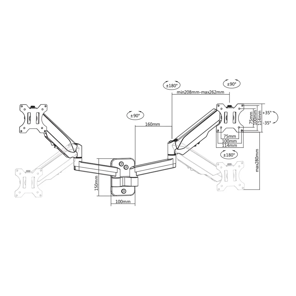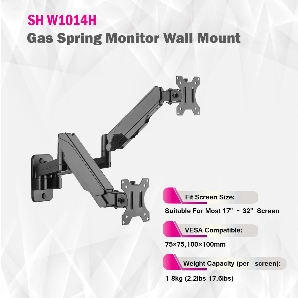 The SHW 1014H Gas Spring Monitor Mount is a standard rank dual monitor arm designed for wall mounting. Made from durable aluminum and plastic with a powder-coated finish, it supports most 17″ to 32″ flat or curved screens weighing 1-8kg each. Featuring a full range of motion—tilt, swivel, and rotation—and a 422mm extension, it optimizes ergonomic comfort while maintaining a sleek, low-profile design with integrated cable management.