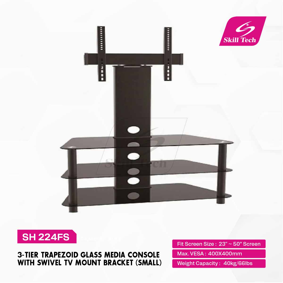 The SH 224FS 3-Tier Trapezoid Glass Media Console is a compact and stylish solution for corner entertainment setups. Ideal for 23"–50" TVs, it features a swivel TV mount bracket and supports up to 40kg. With a sleek black silkscreen glass finish, powder-coated steel columns, and three sturdy tiers, it offers both durability and modern appeal. Its space-saving cantilever design makes it perfect for small to medium-sized living areas.