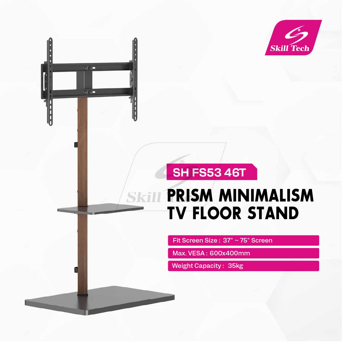 The SH FS53 46T Prism Minimalism TV Floor Stand combines style and function with its sleek design, powder-coated steel column, and fine texture finish in black or white. Supporting 37" to 75" flat or curved TVs, it offers adjustable height, a +5° to -10° tilt, and built-in cable management. With a 35kg weight capacity and a pedestal base, it's a modern, space-saving solution for any living space.